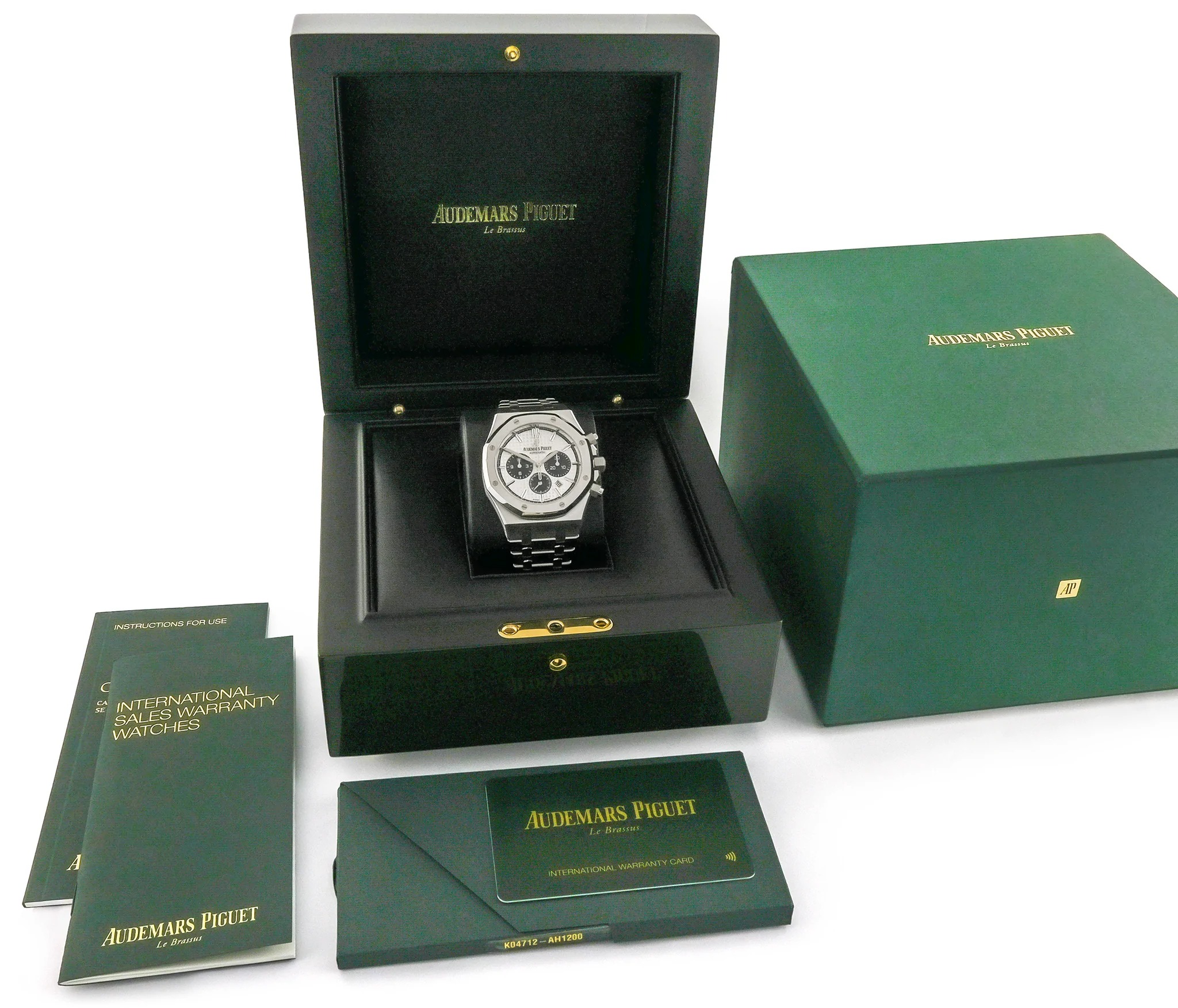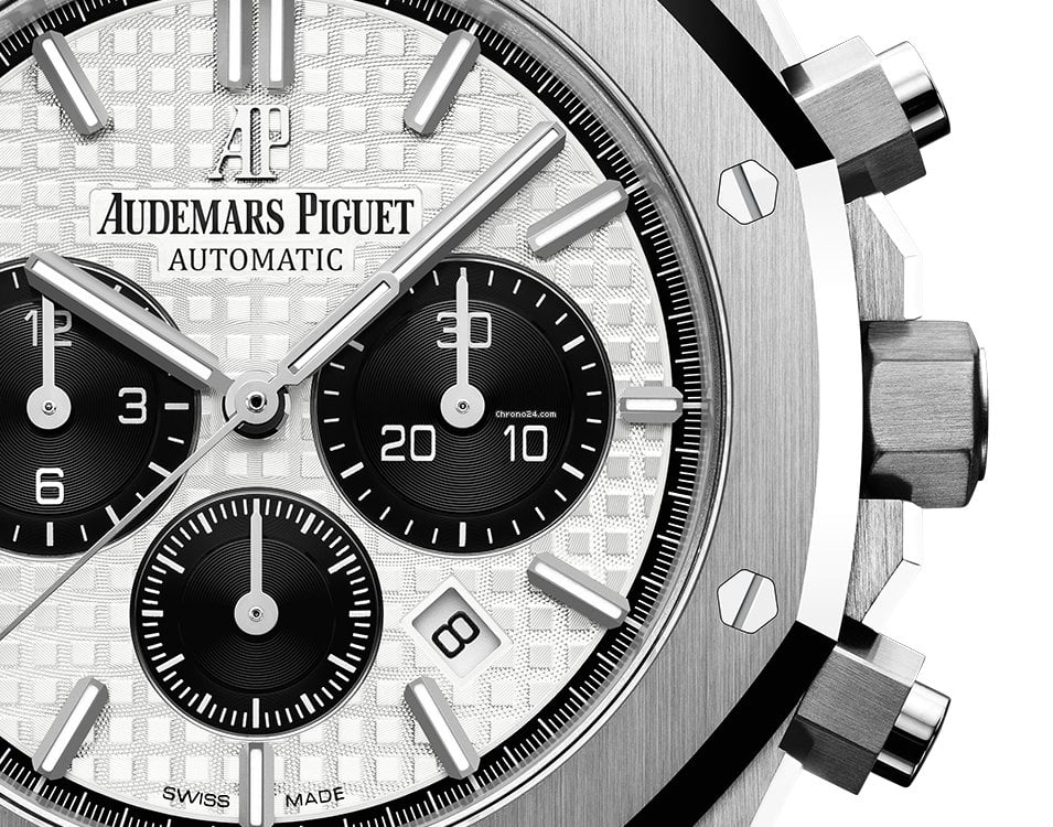Silver-toned dial with “Grande Tapisserie” pattern, black counters and extern zone, white gold applied hour-markers and Royal Oak hands with luminescent coating.