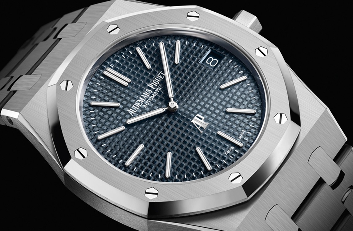 “Bleu nuit nuage 50” dial with “Petite Tapisserie” pattern, white gold applied hour-markers and Royal Oak hands with luminescent coating.