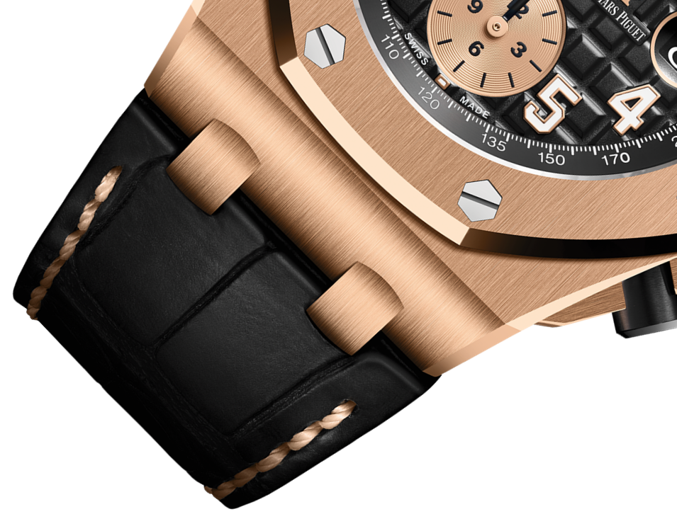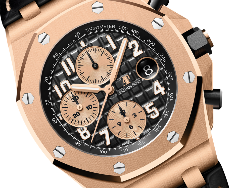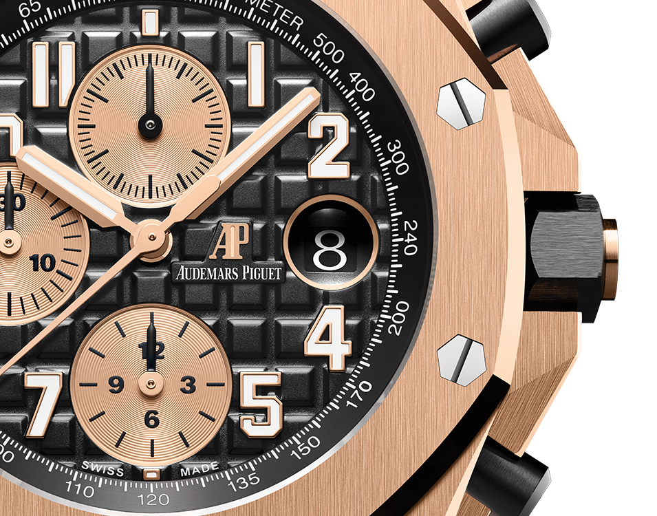 Black dial engraved with "Méga Tapisserie" oversized check decoration, with rose gold sub-dials, rose gold applied hour-markers and Royal Oak hands with luminescent coating, black inner bezel.