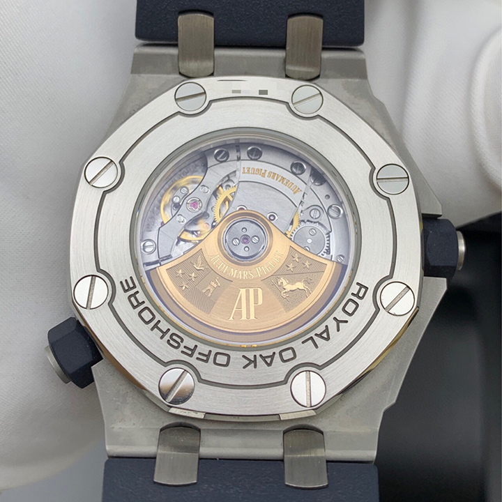 Stainless steel case, glareproofed sapphire crystal and caseback, blue rubber-clad screw-locked crowns.
