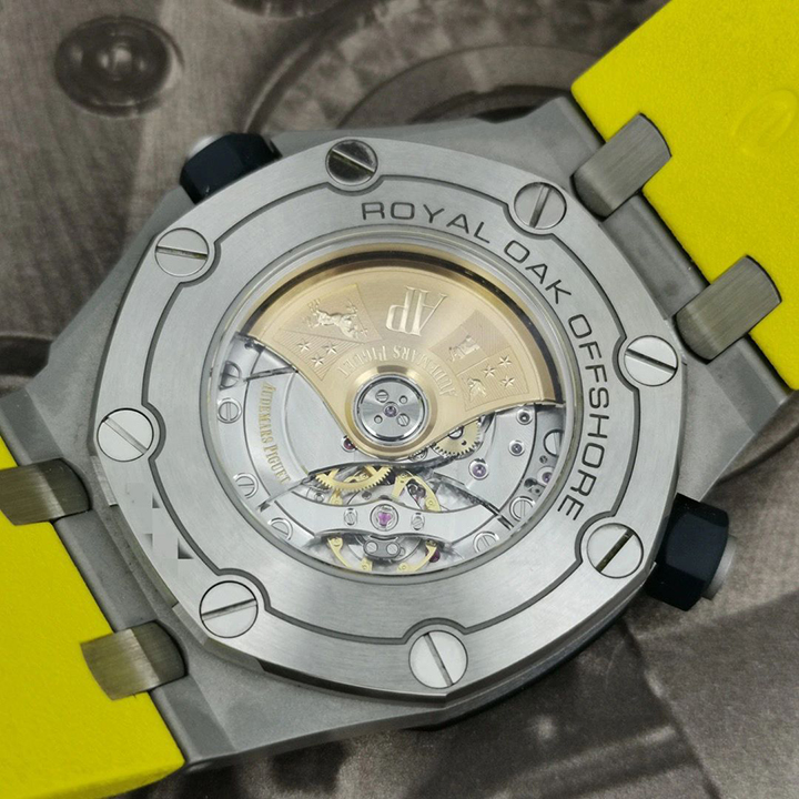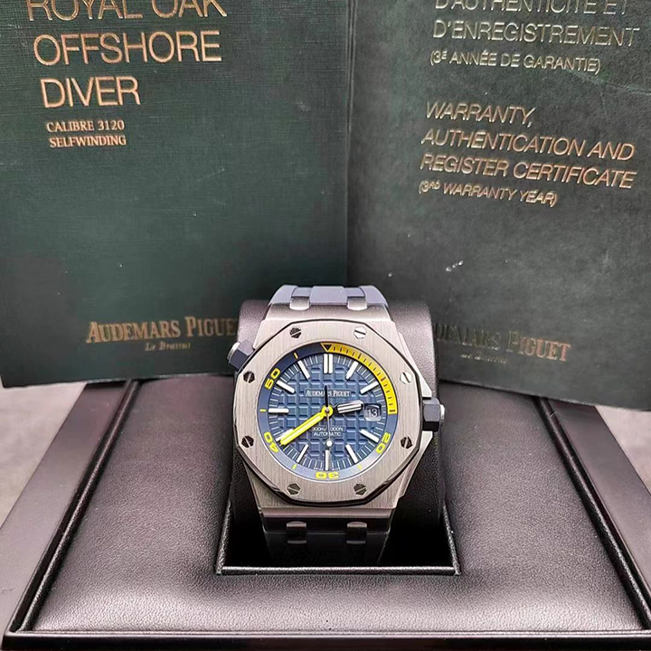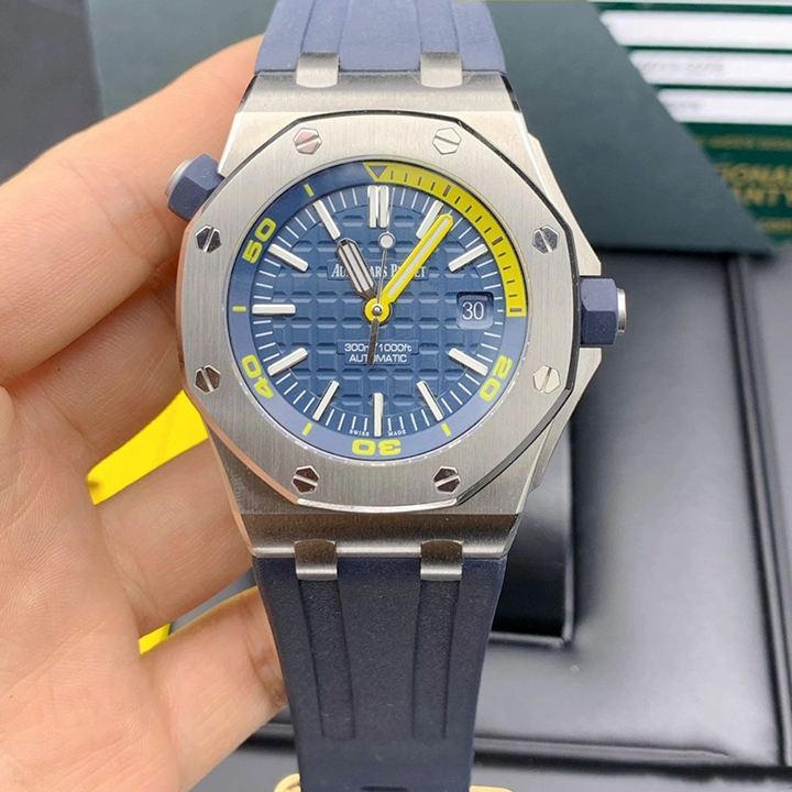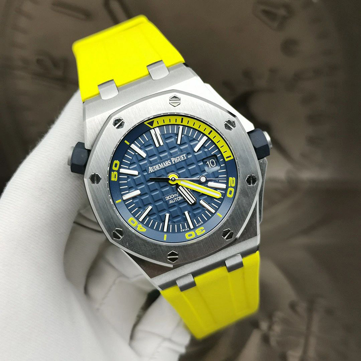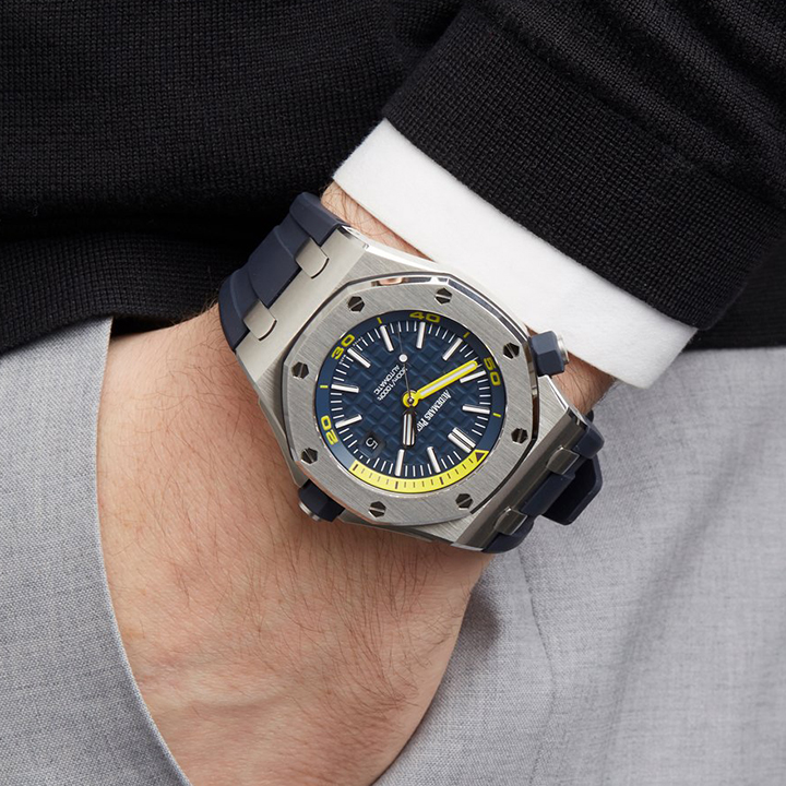Blue dial with “Méga Tapisserie” pattern, white gold applied hour-markers and Royal Oak hands (yellow minutes hand) with luminescent coating, blue rotating inner bezel with diving scale and zone from 60 to 15 minutes in yellow.