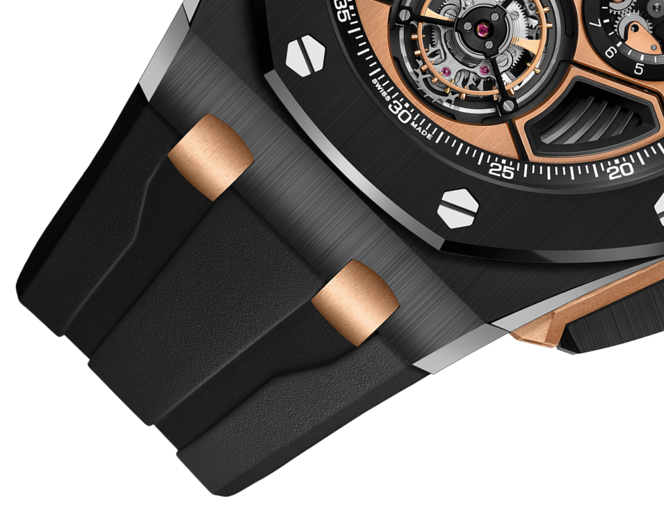 Black counters and inner bezel, pink gold Royal Oak Offshore hands with luminescent coating.
