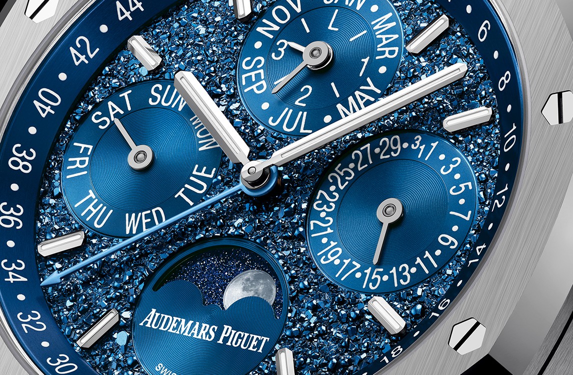 Blue “Crystal Sky” finished dial, white gold applied hour-markers and Royal Oak hands with luminescent coating.