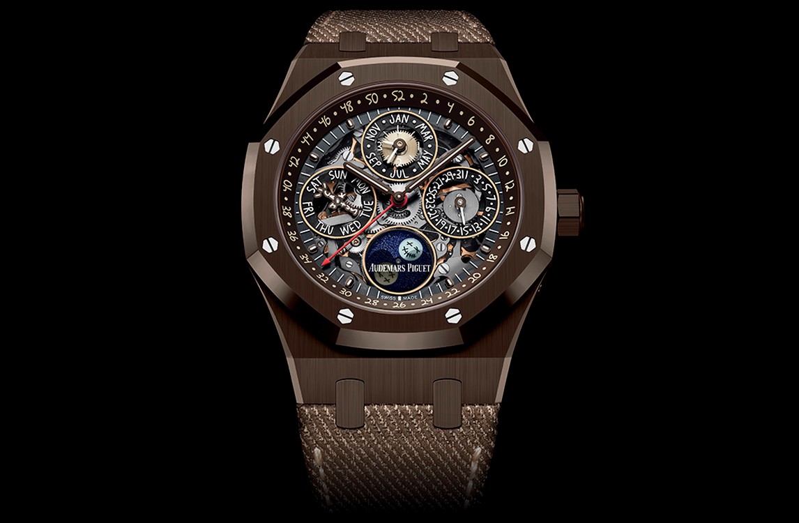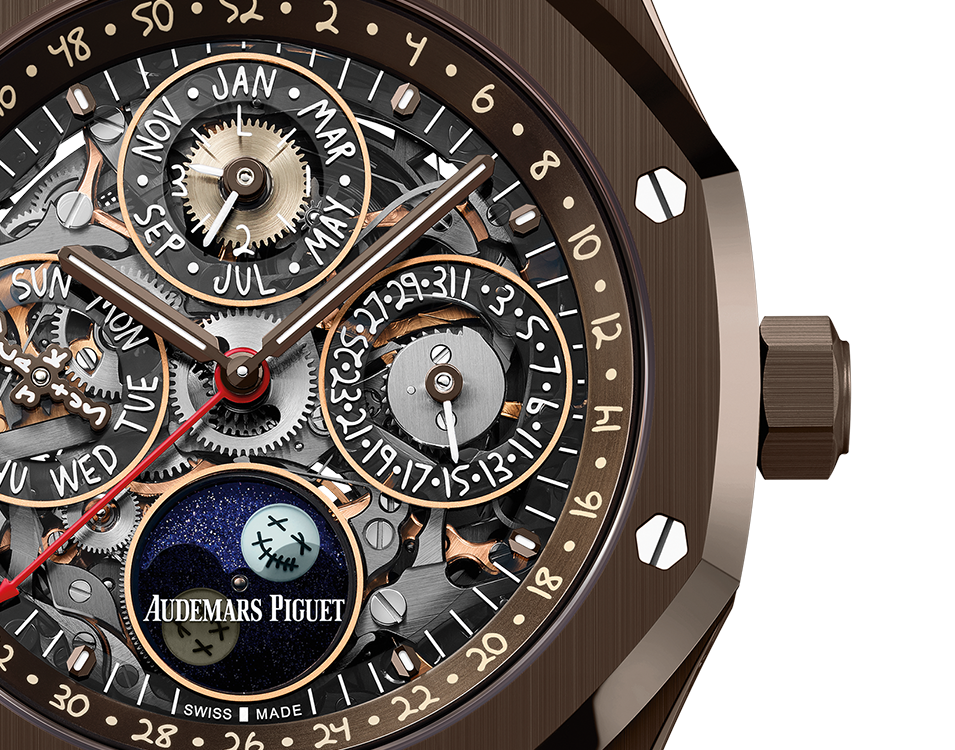 Sapphire dial, smoked external zones of the counters, brown applied hour-markers and Royal Oak hands with luminescent coating, brown inner bezel.