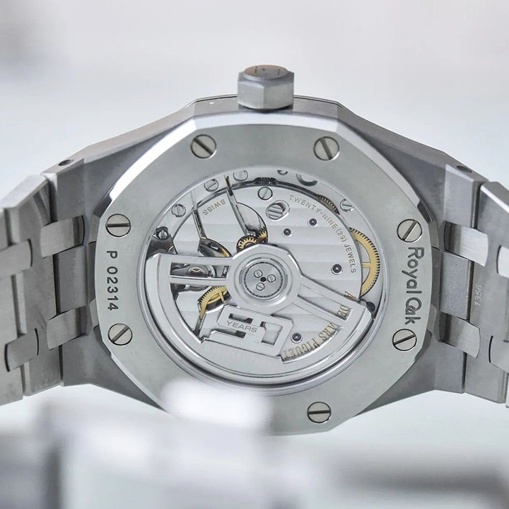In addition to showcasing the new Royal Oak design evolution, this 37 mm stainless steel timepiece adorns a light blue “Grande Tapisserie” dial. The model is equipped with the new selfwinding Calibre 5900 and the "50-years" oscillating weight in rhodium-toned pink gold.