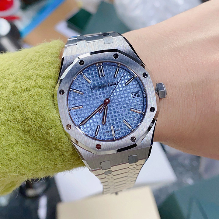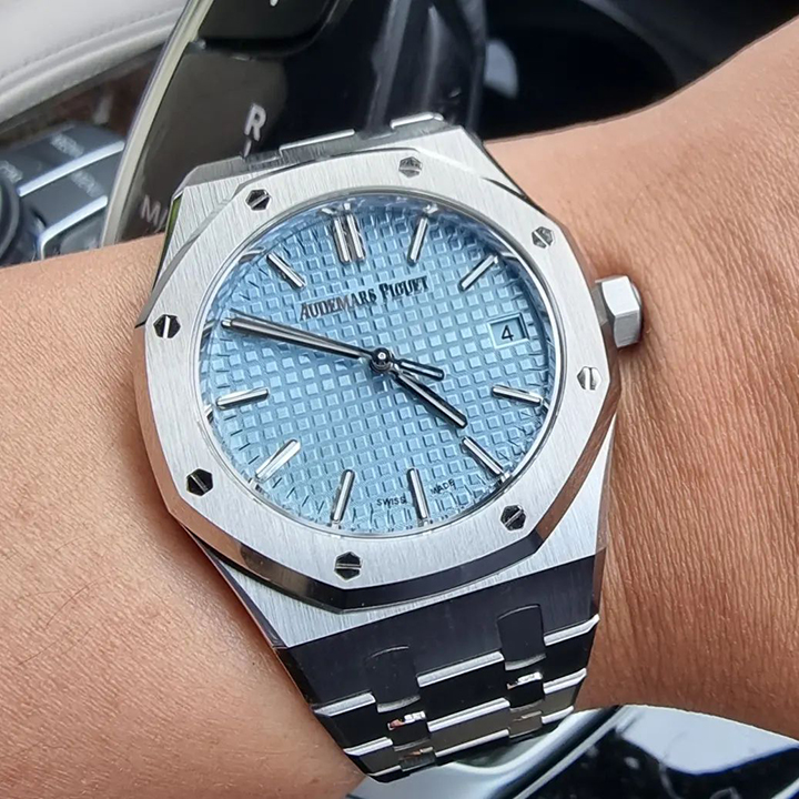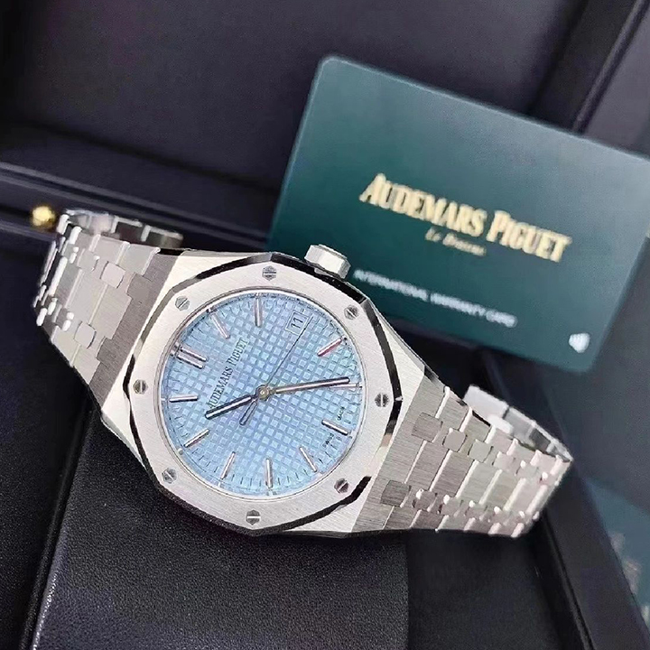 Light blue dial with “Grande Tapisserie” pattern, white gold applied hour-markers and Royal Oak hands with luminescent coating.