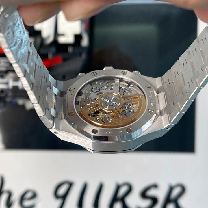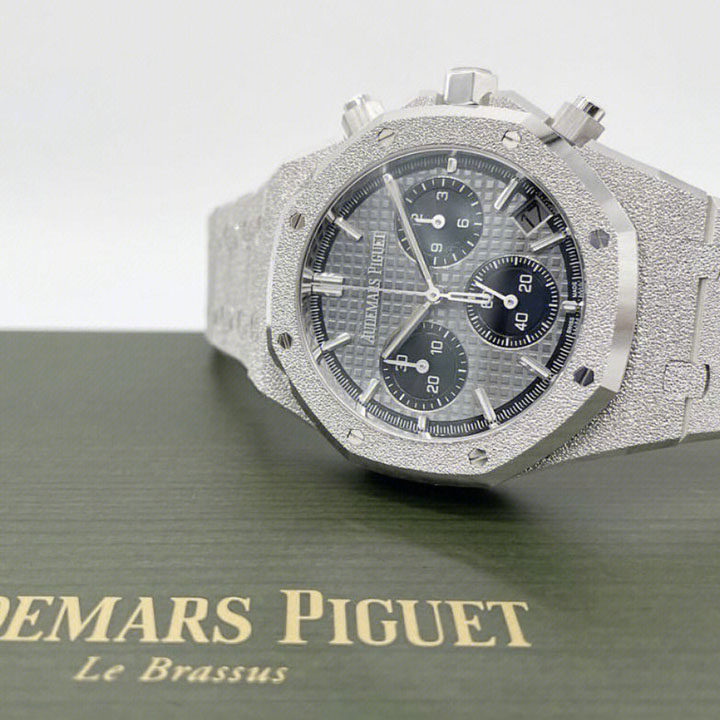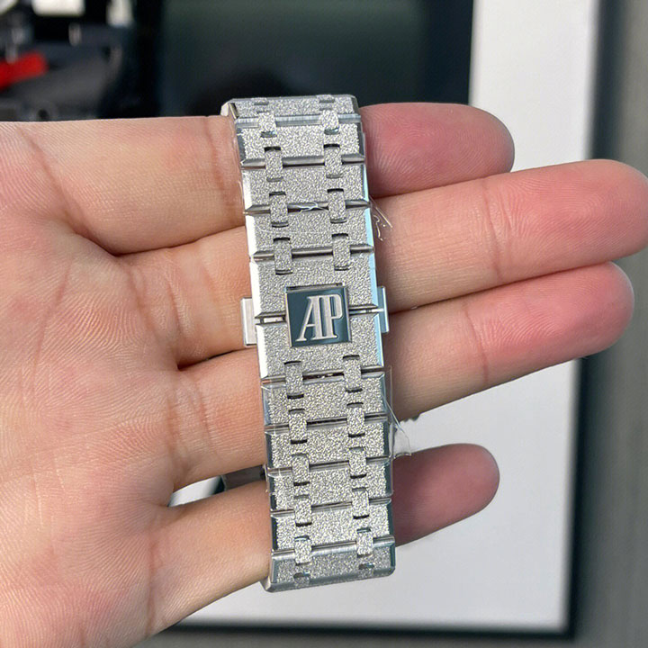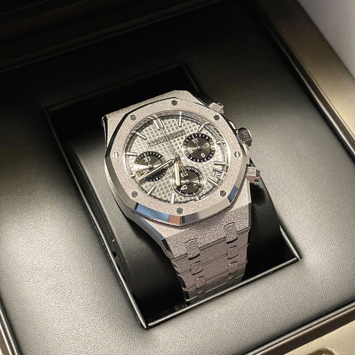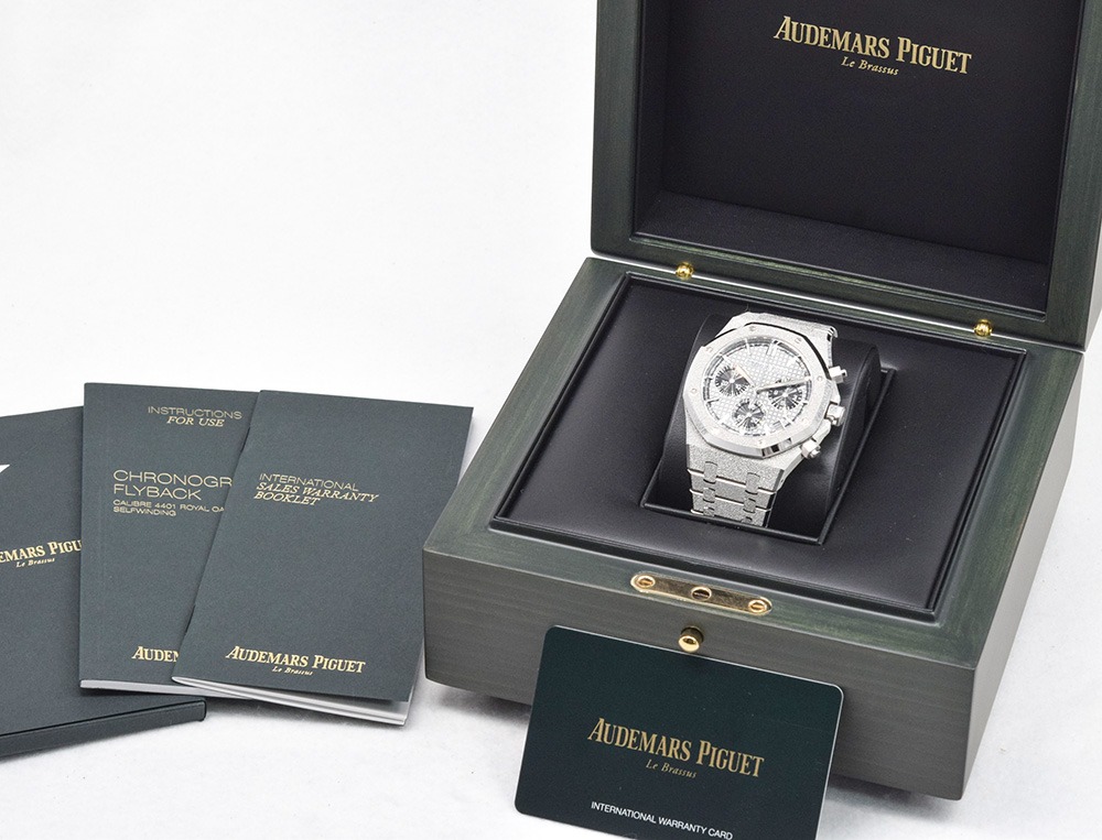 Grey dial with “Grande Tapisserie” pattern, black counters, white gold applied hour-markers and Royal Oak hands with luminescent coating.