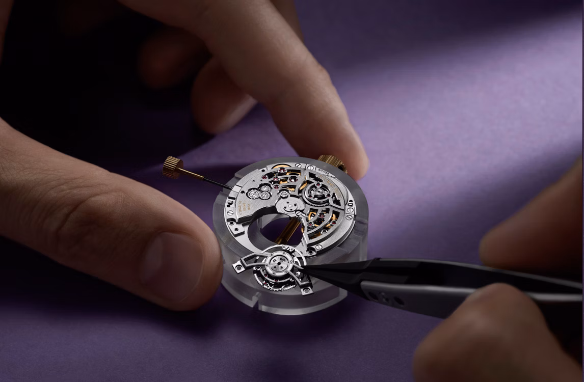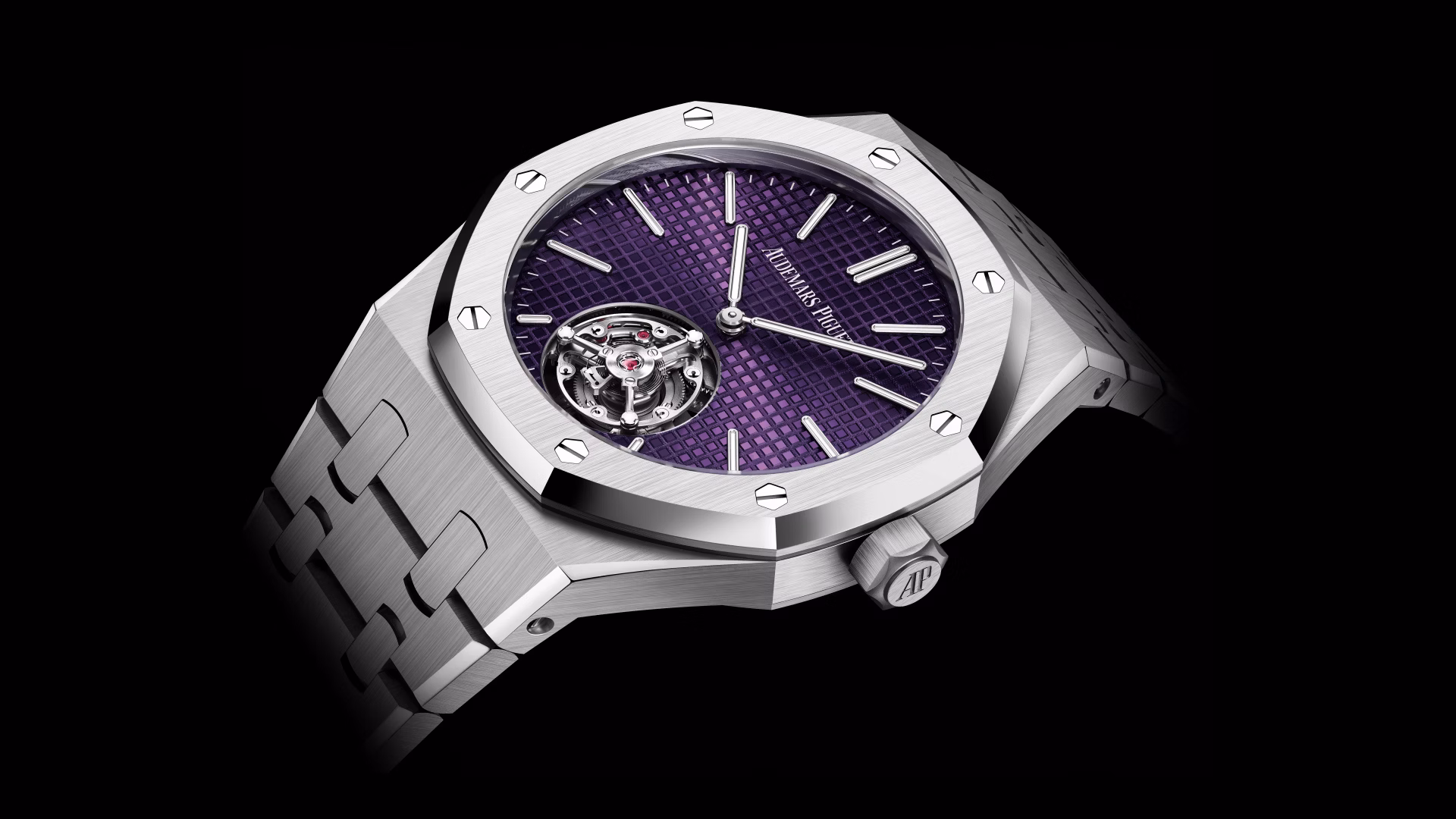This extra-thin 37 mm Royal Oak, powered by Calibre 2968, embodies the Manufacture's first ever selfwinding flying tourbillon offered in a 37 mm diameter. Endowed with a new plum "Petite Tapisserie" dial and an innovative escapement system, this stainless steel timepiece blends technical feats with meticulous aesthetic.