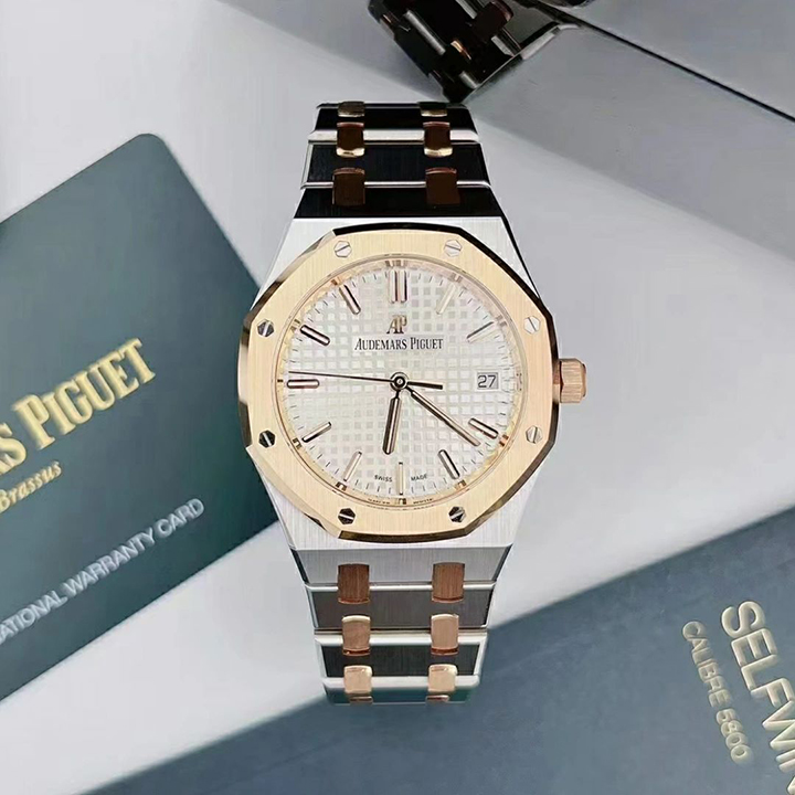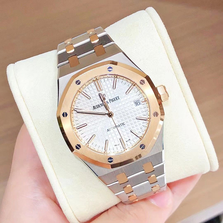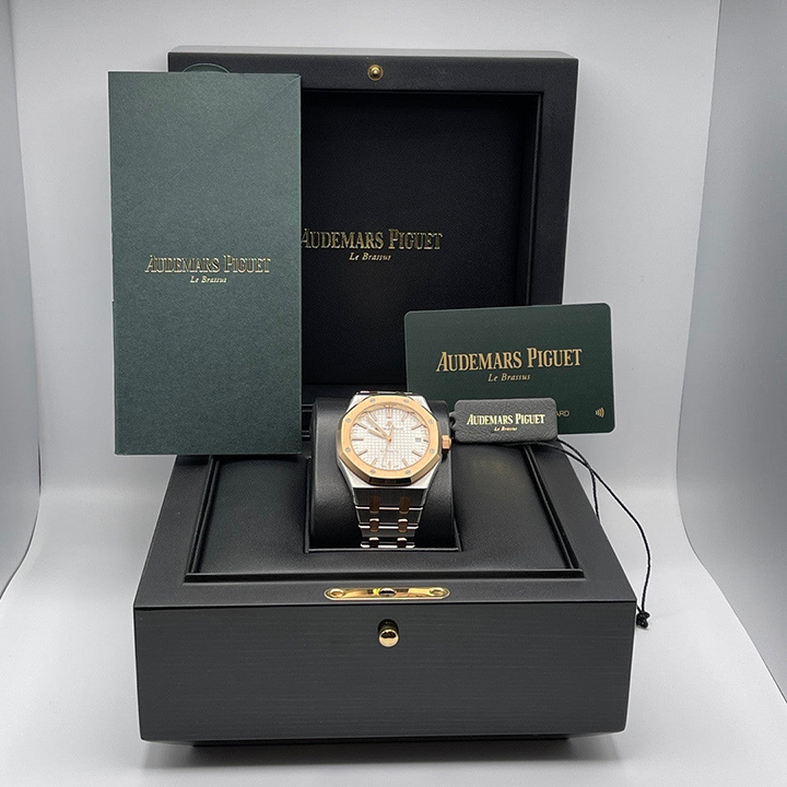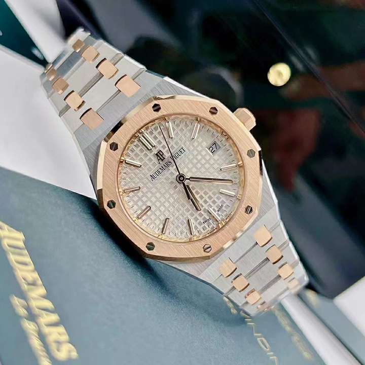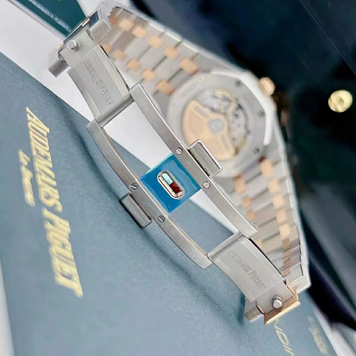 Silver-toned dial with “Grande Tapisserie” pattern, pink gold applied hour-markers and Royal Oak hands with luminescent coating.