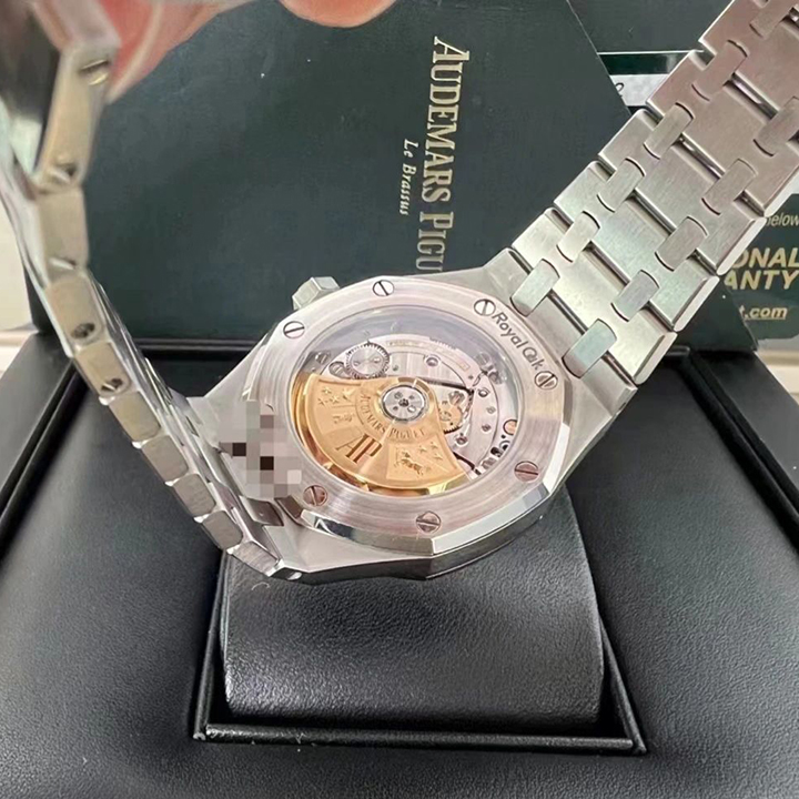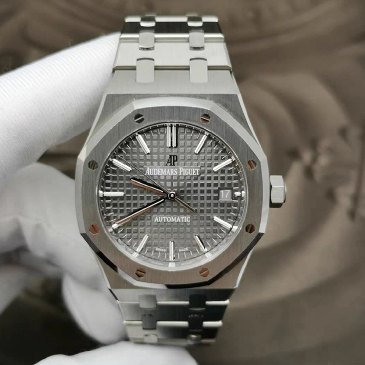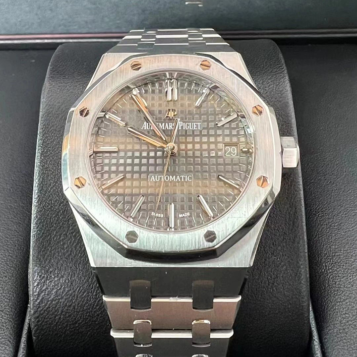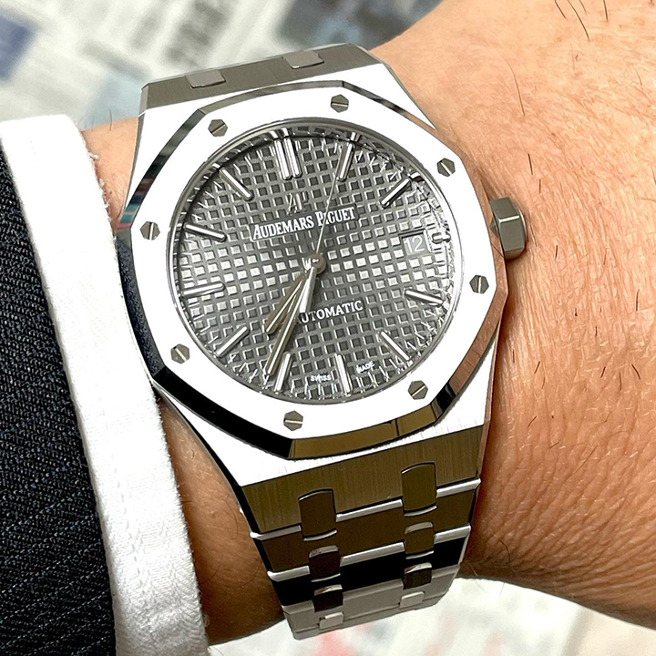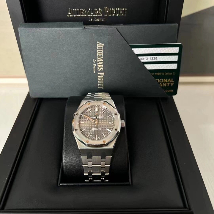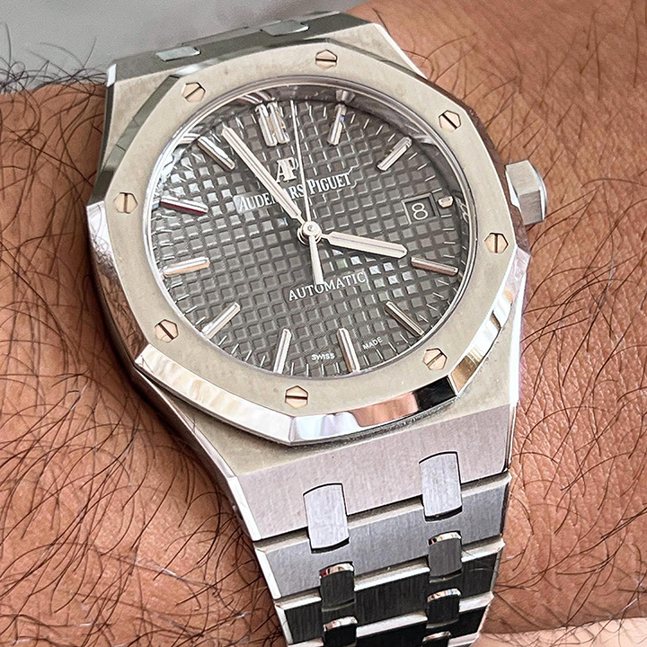 Ruthenium-toned dial with “Grande Tapisserie” pattern, white gold applied hour-markers and Royal Oak hands with luminescent coating.
