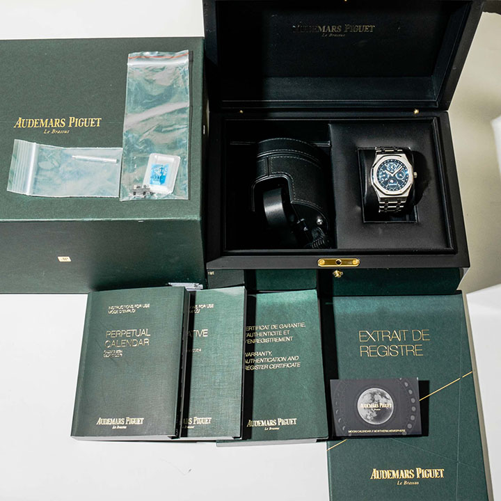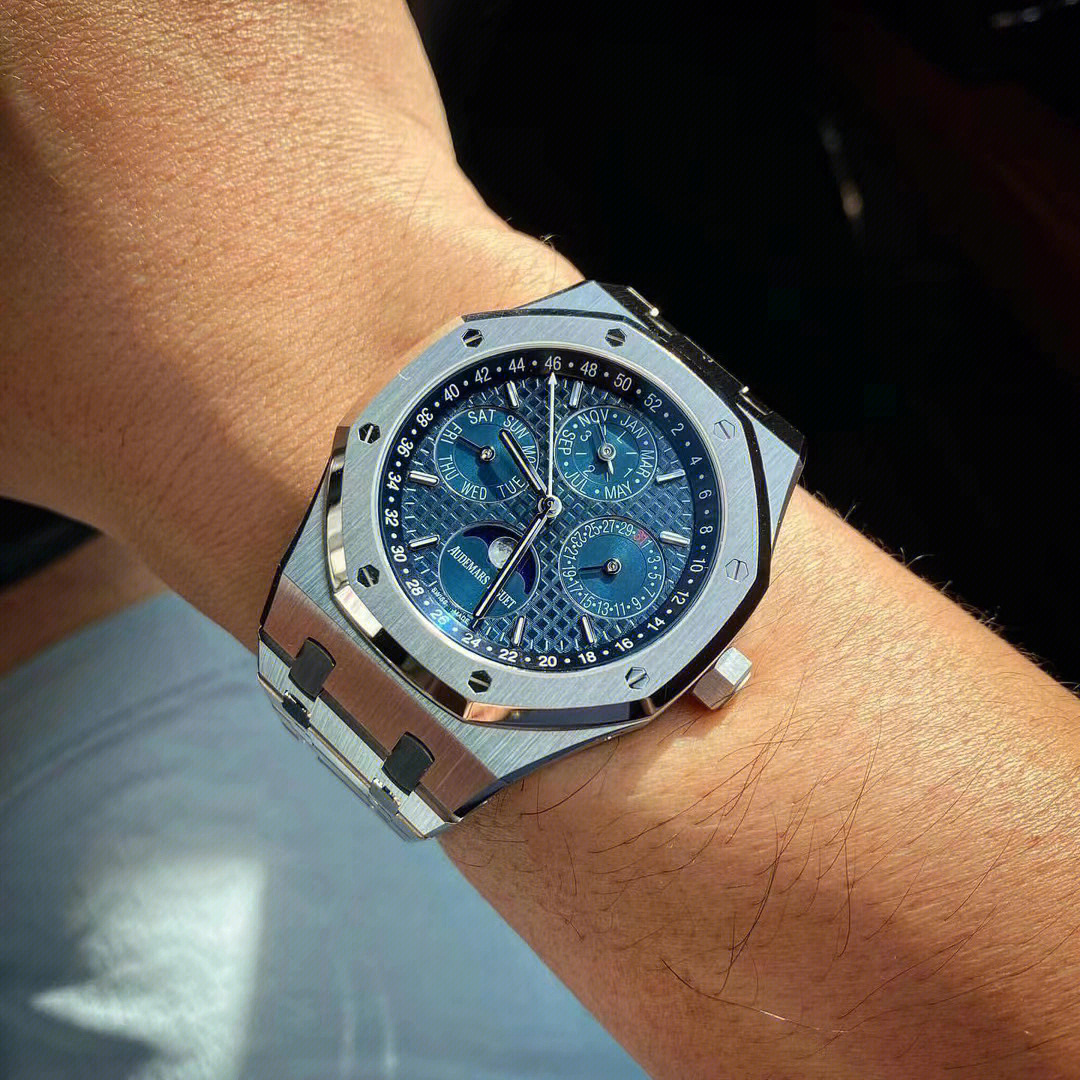 Blue dial with “Grande Tapisserie” pattern, blue counters, white gold applied hour-markers and Royal Oak hands with luminescent coating, blue inner bezel