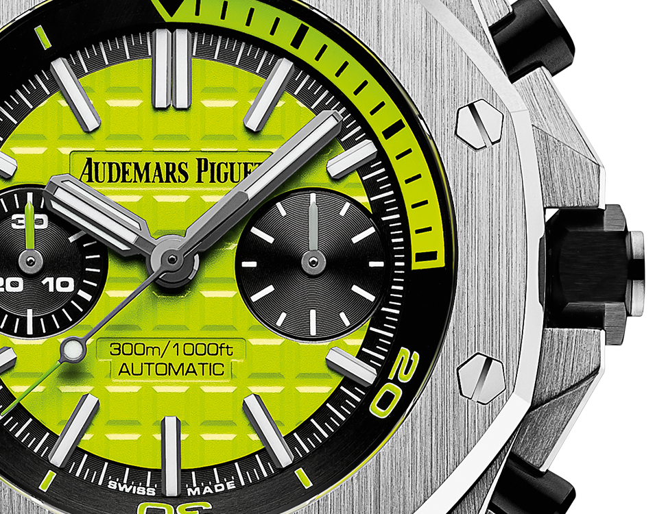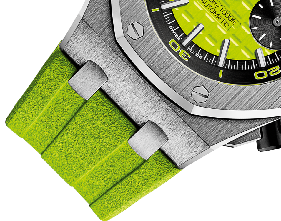 A bold lime green Royal Oak Offshore, blending exceptional craftsmanship and fun design. The dial features the traditional "Mega Tapisserie" pattern with double hour-markers at 12 o'clock and luminescent coating for better visibility deep under water. The rubber strap, coordinated with the color of the dial, ensures a perfect fit on the wrist.