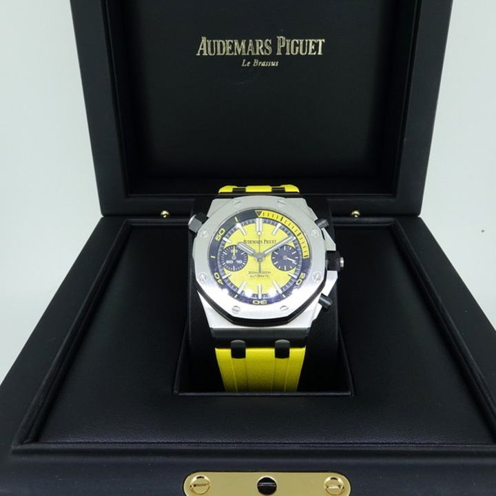Yellow dial with “Méga Tapisserie” pattern, black counters, blackened gold applied hour-markers and Royal Oak hands with luminescent coating, black rotating inner bezel with diving scale and zone from 60 to 15 minutes in yellow.