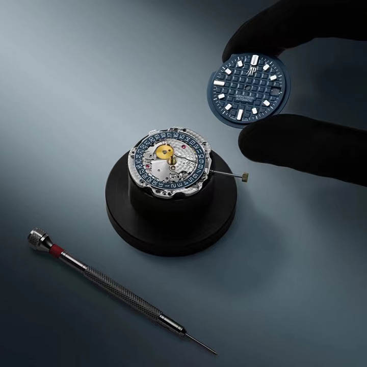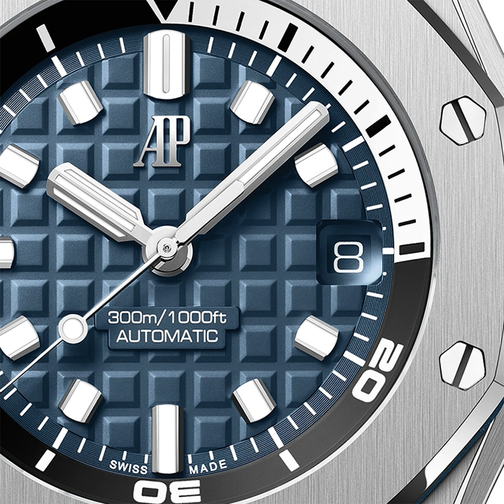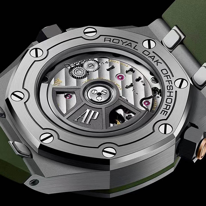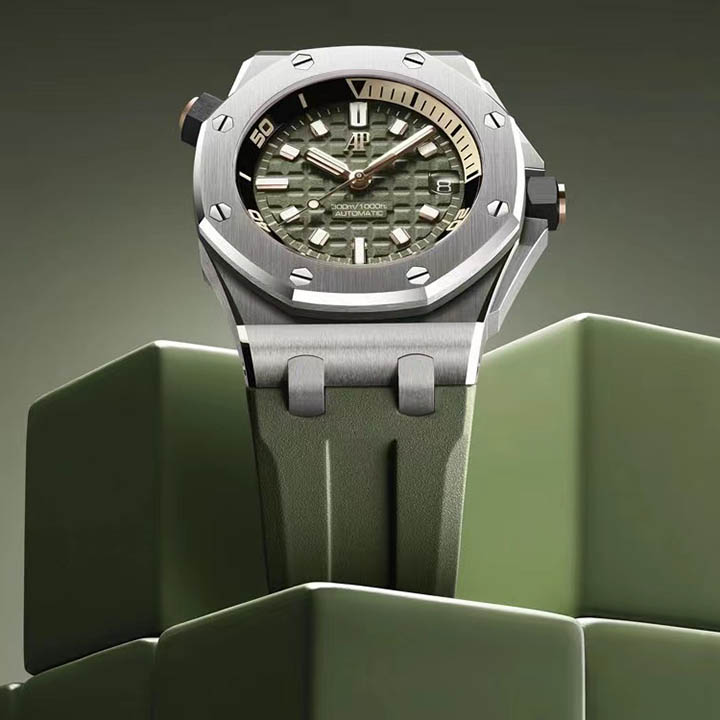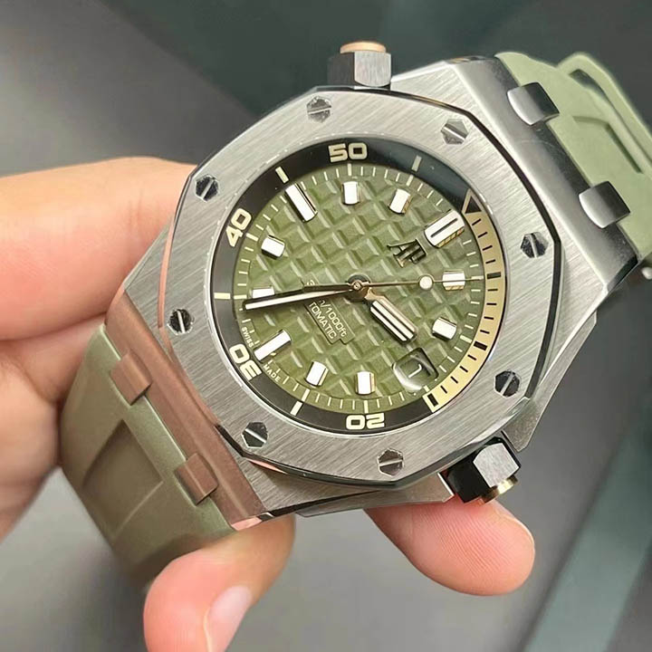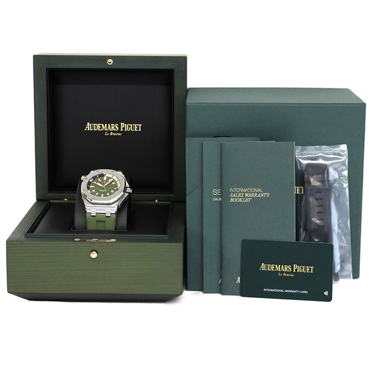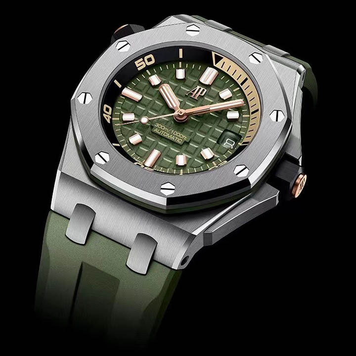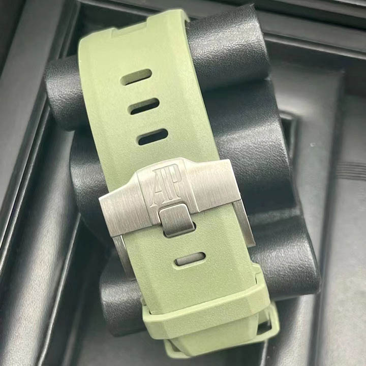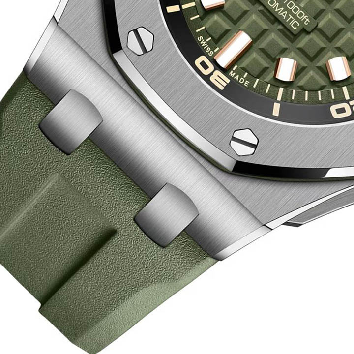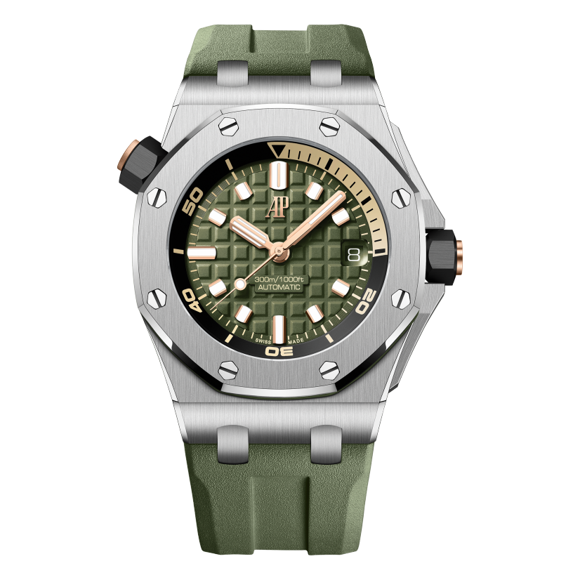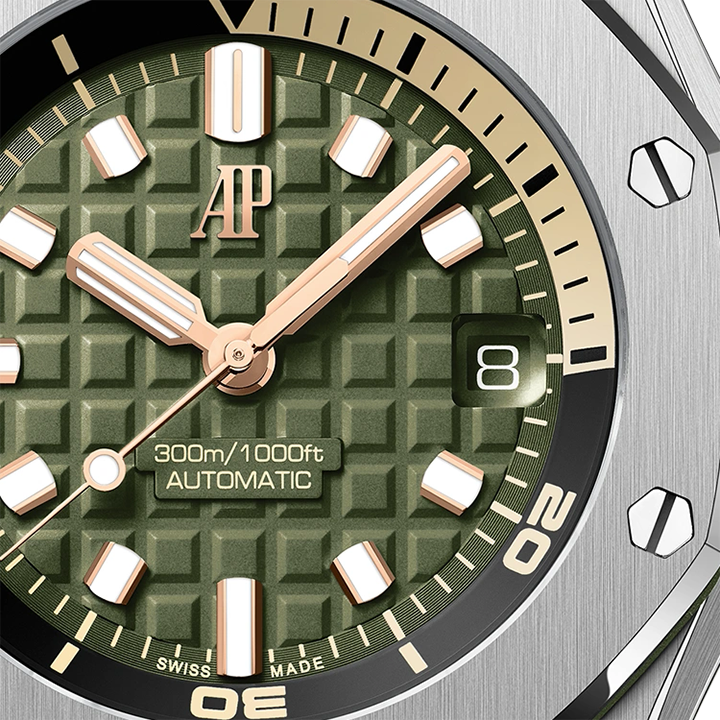 Army green dial with "Méga Tapisserie" engraved oversized check, rose gold luminescent applied hour-markers and Royal Oak hands, black rotating inner bezel with beige 0 to 15 minutes zone