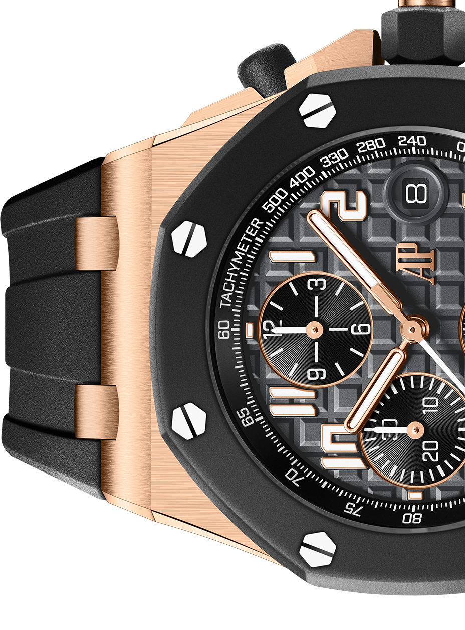 The new 42 mm Royal Oak Offshore iteration contrasts an 18-carat pink gold case with a black rubber bezel, a black Grande Tapisserie dial and a black interchangeable rubber strap for a sporty and elegant look.