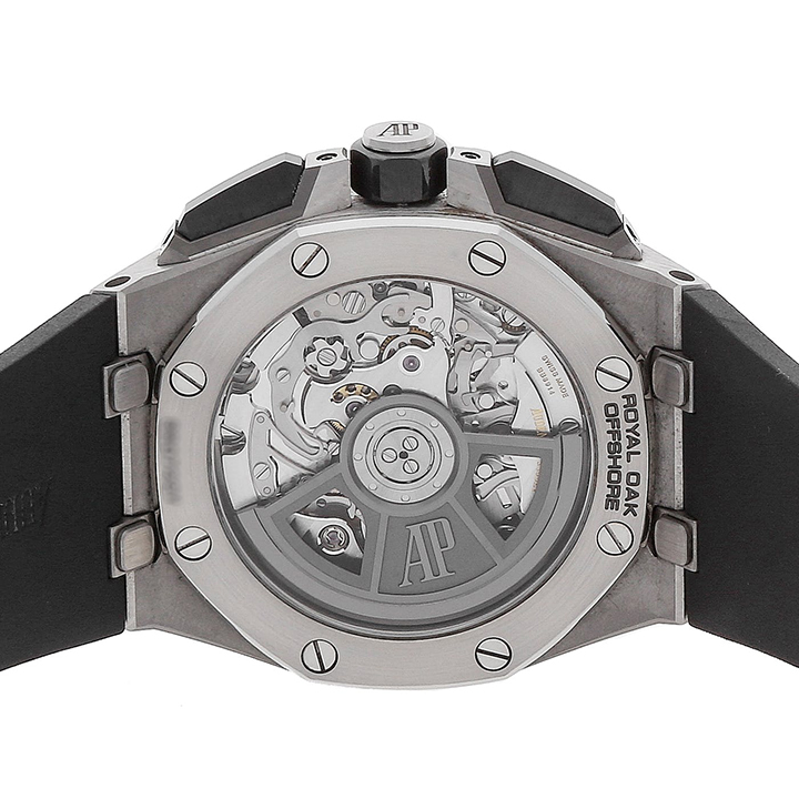 Black rubber strap with stainless steel AP pin buckle and interchangeable strap system. Additional brown calfskin strap