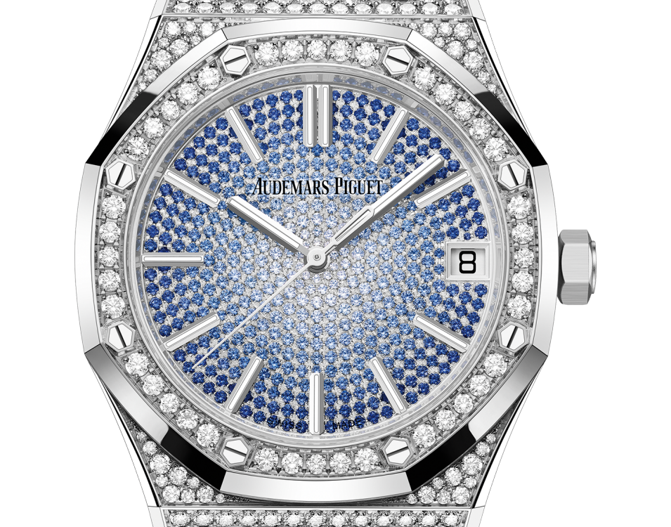 While the case and bracelet of this 41 mm white gold Royal Oak Selfwinding sparkles with brilliant-cut diamonds, the dial is paved with brilliant-cut graded blue sapphires radiating from the centre. The timepiece also features the collection’s new design evolution and the "50-years" oscillating weight.