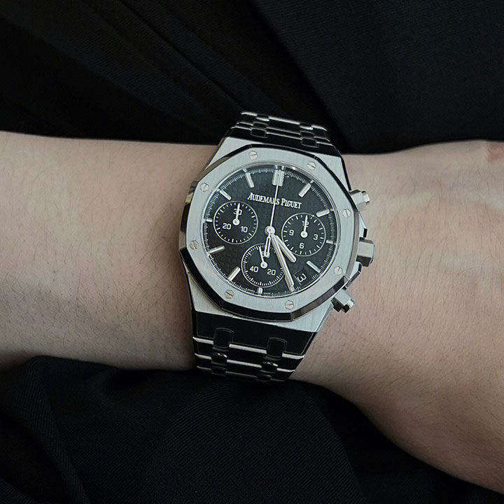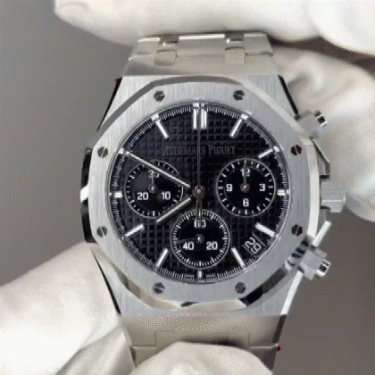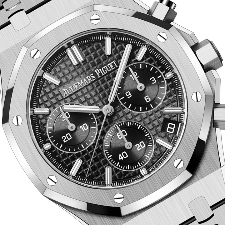 This 41 mm Selfwinding Chronograph encompasses the latest Royal Oak design evolution. Its stainless steel case and bracelet are embellished with a black “Grande Tapisserie” dial.