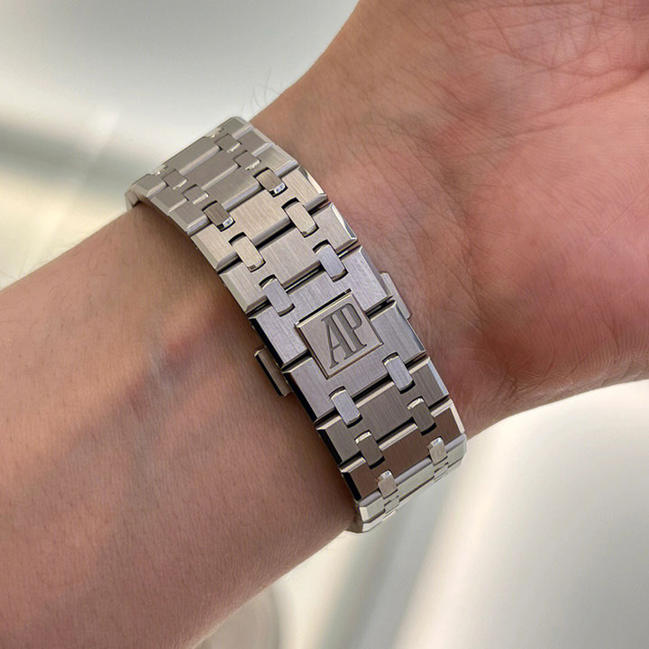 Black dial with “Grande Tapisserie” pattern, black counters, white gold applied hour-markers and Royal Oak hands with luminescent coating.