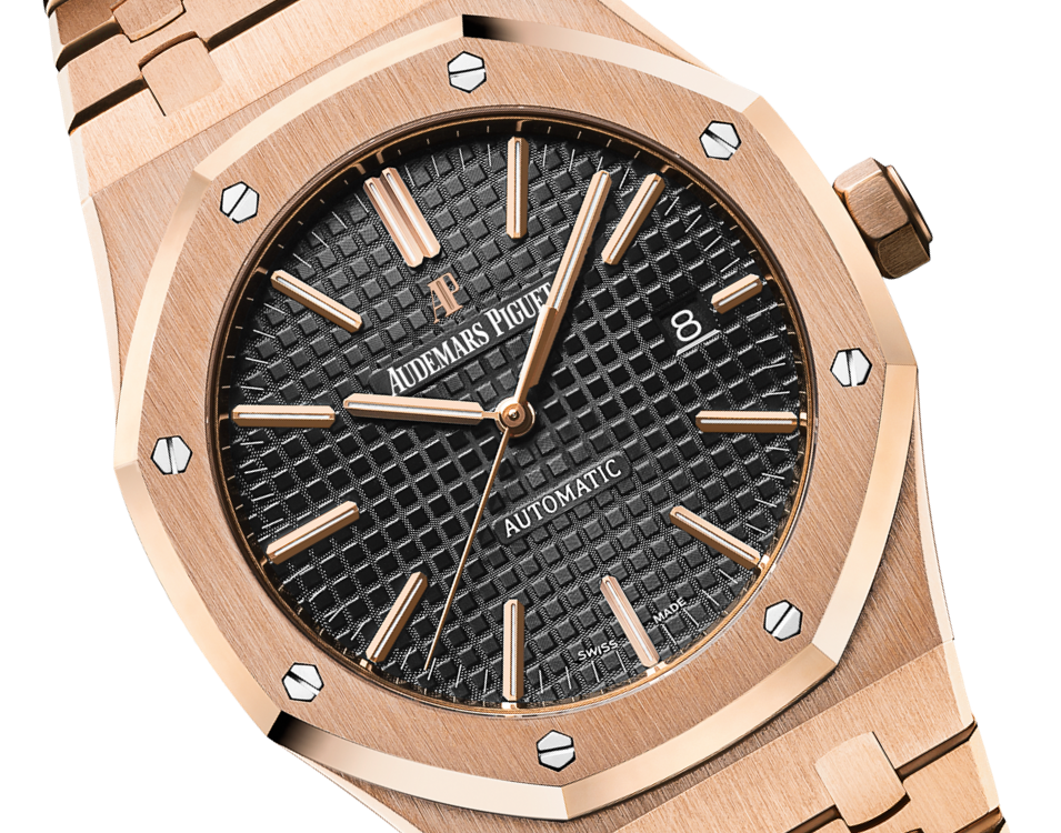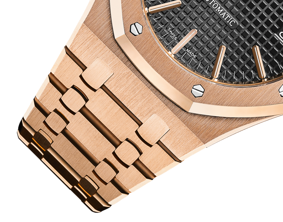 Black dial with “Grande Tapisserie” pattern, pink gold applied hour-markers and Royal Oak hands with luminescent coating