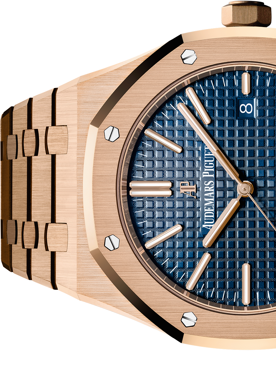 Blue dial with “Grande Tapisserie” pattern, pink gold applied hour-markers and Royal Oak hands with luminescent coating.