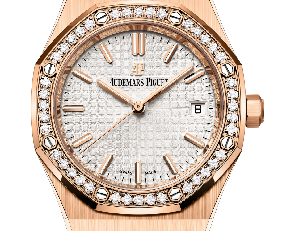 Audemars Piguet launches its first 34 mm Selfwinding Royal Oak. The silver-toned “Grande Tapisserie” dial of this 18-carat pink gold model is adorned with a diamond-set bezel.
