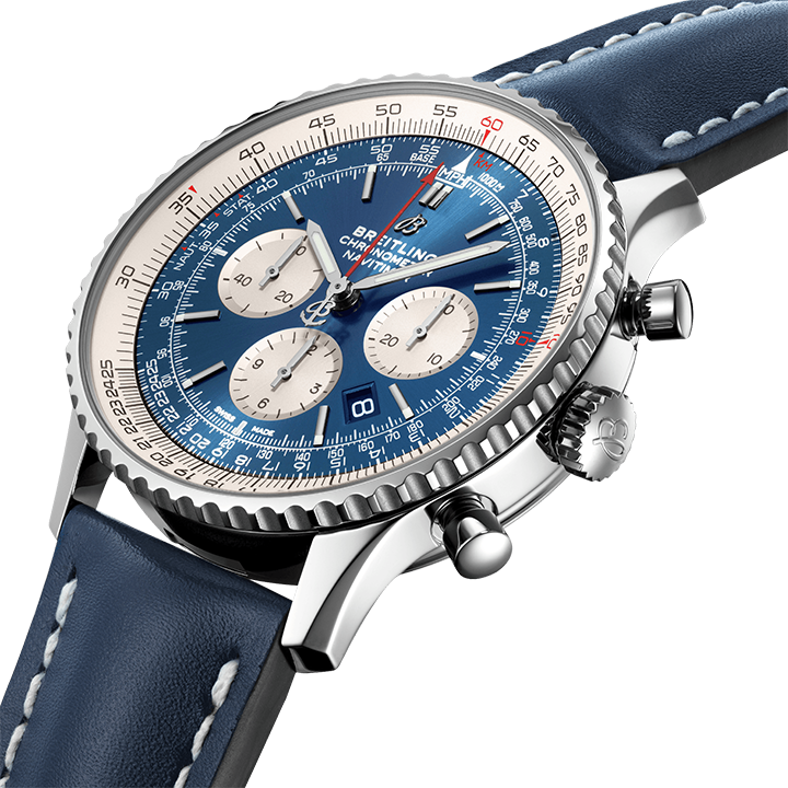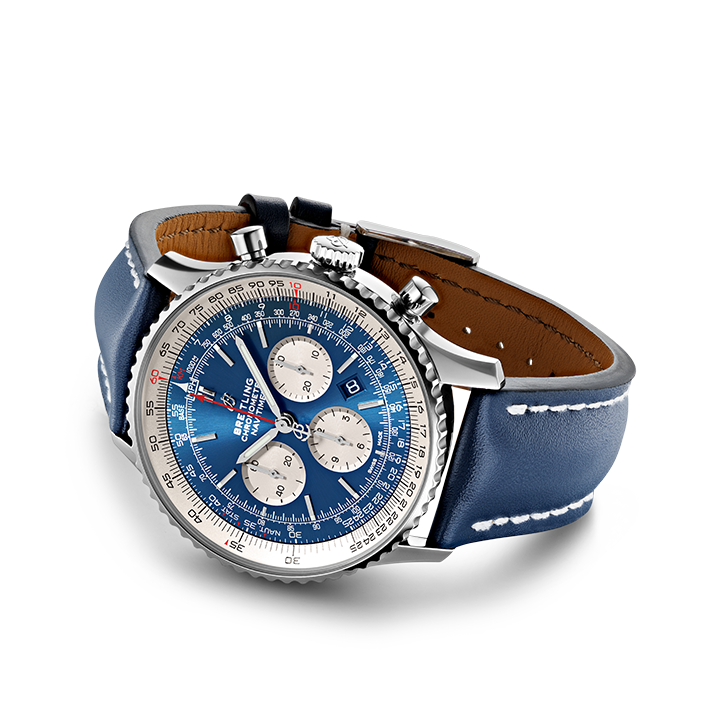 Breitling Navitimer 1 B01 Chronograph 46 AB0127211C1X2 men's watch. Features a polished stainless steel case and blue leather strap. Polished stainless steel bidirectional rotating bezel. Aurora blue dial with luminescent hands and index hour markers. Date displayed in dial aperture between 4 and 5 o'clock.