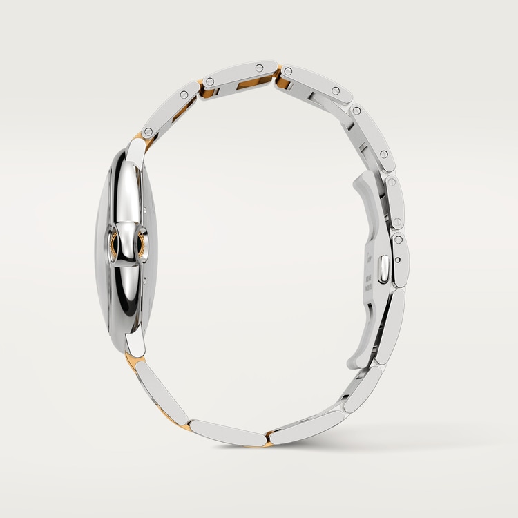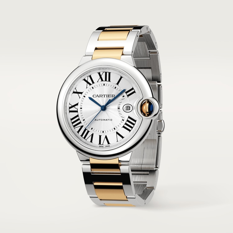 Ballon Bleu de Cartier watch, 42mm. Mechanical self-winding movement, caliber 1847 MC. Stainless steel case, 18K yellow gold (750/1000) fluted crown set with a synthetic spinel cabochon. Guilloché dial in silver-tone. Blued steel sword-shaped hands. Sapphire crystal. Date window at 3 o'clock. Two-tone interchangeable bracelets. Thickness: 13mm. Water-resistant to 3 bar (approx. 30 meters/100 feet).