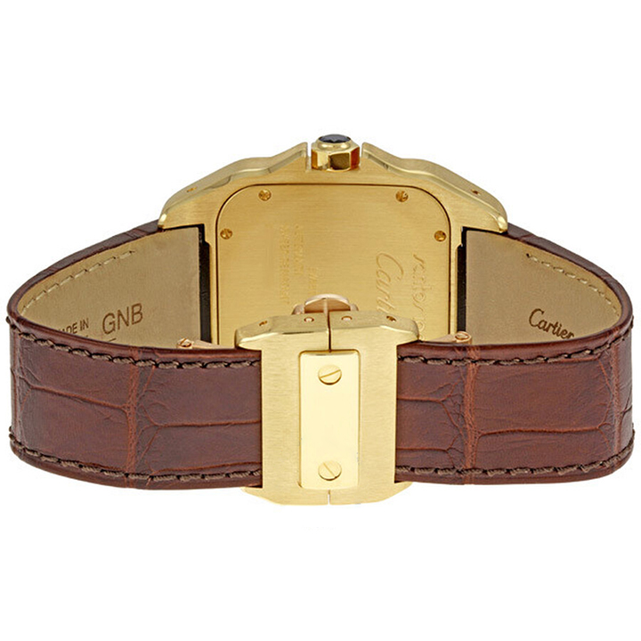 18kt yellow gold case with a brown leather strap. Fixed 18kt yellow gold bezel. Silver dial with luminous hands and Roman numeral hour markers. Minute markers around an inner ring. Automatic movement. Scratch resistant sapphire crystal. Octagonal set crown inlaid with a faceted sapphire. Solid case back. Case diameter: 38 mm x 51 mm. Case thickness: 10 mm. Fold-under deployment clasp. Water resistant at 100 meters / 330 feet. Functions: hours, minutes, seconds. AdditionalInfo: 18kt yellow gold octagonal crown set with faceted sapphire. Cartier Santos 18kt Yellow Gold Men's Watch W20071Y1.