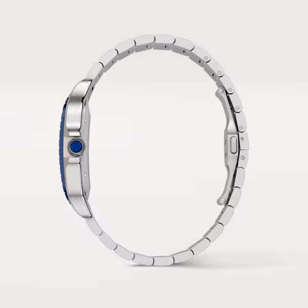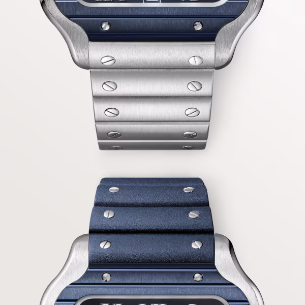 Santos de Cartier watch, large model, Manufacture mechanical movement with automatic winding, calibre 1847 MC. Steel case, PVD bezel, steel crown set with a faceted blue synthetic spinel, blue striated dial, steel sword-shaped hands with luminescent material also on the hour markers, sapphire crystal. Steel strap with "SmartLink" adjustment system. Second strap in blue rubber, with interchangeable steel folding buckle. Both straps are fitted with the "QuickSwitch" interchangeable system. Case width: 39.8 mm, thickness: 9.38 mm. Water-resistant up to 10 bar (approx. 100 metres).