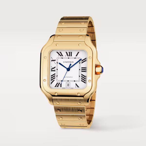 Santos watch, large model, mechanical movement with automatic winding, calibre 1847 MC. Yellow gold 750/1000 case, yellow gold 750/1000 7-sided crown set with a faceted sapphire, silvered opaline dial, blued-steel sword-shaped hands, sapphire crystal. Yellow gold 750/1000 bracelet with “SmartLink” adjustment system. Second bracelet in alligator skin, with interchangeable yellow gold 750/1000 folding buckle. Both bracelets are fitted with the “QuickSwitch” interchangeability system. Case width: 39.8 mm, thickness: 9.38 mm. Water-resistant to 10 bar (approx. 100 metres).
