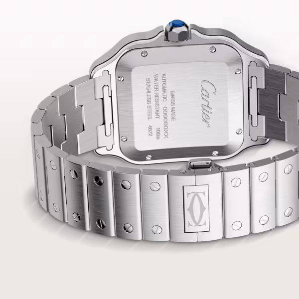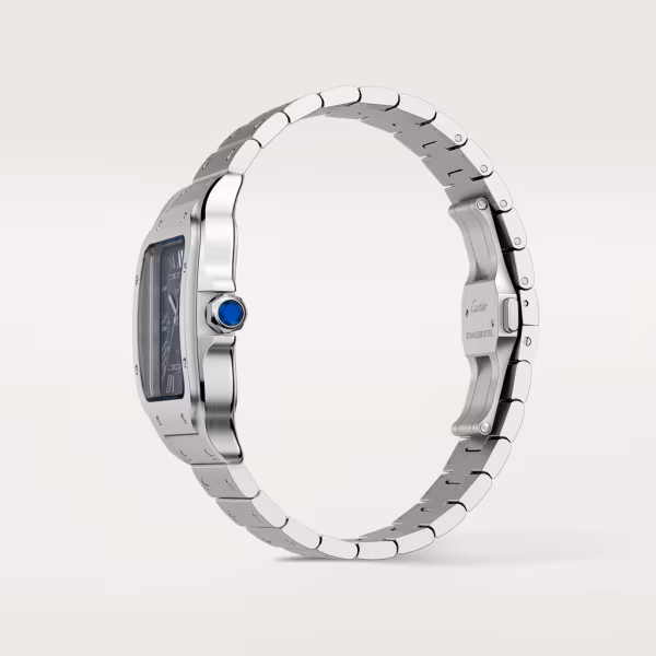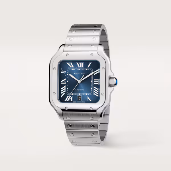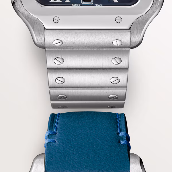 Santos watch, large model, mechanical movement with automatic winding, calibre 1847 MC. Steel case, 7-sided crown set with a faceted synthetic spinel, graduated blue dial, steel sword-shaped hands, sapphire crystal. Steel bracelet with "SmartLink" adjustment system. Second bracelet in navy blue calfskin, with interchangeable steel folding buckle. Both are fitted with the "QuickSwitch" interchangeable system. Case width: 39.8 mm, thickness: 9.38 mm. Water-resistant to 10 bar (approx. 100 metres).