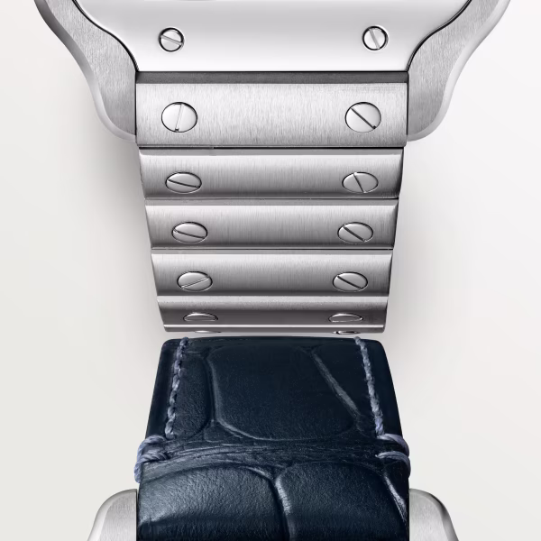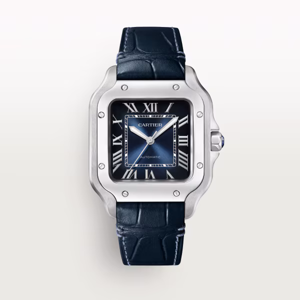 Santos de Cartier watch, medium model, mechanical movement with automatic winding 1847 MC. Steel case, 7-sided crown with synthetic faceted blue spinel, graduated blue dial, polished steel sword-shaped hands with luminescent material, sapphire crystal. Steel bracelet with SmartLink adjustment system. Second strap in blue alligator skin, with interchangeable folding steel buckle. Both are fitted with the QuickSwitch interchangeable system. Case width: 35.1 mm, thickness: 8.83 mm. Water-resistant up to 10 bar (approx. 100 metres).