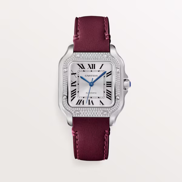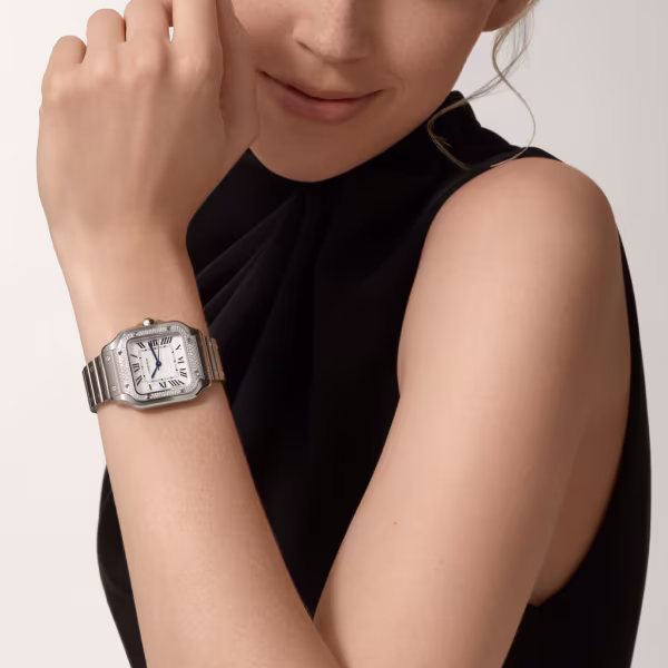 Santos watch, medium model, mechanical movement with automatic winding, calibre 1847 MC. Steel case, steel bezel set with 206 brilliant-cut diamonds totalling 0.64 carat. 7-sided crown set with a faceted synthetic spinel, sunray dial, blued-steel sword-shaped hands, sapphire crystal. Steel bracelet with "SmartLink" adjustment system. Second strap supplied in calfskin, with interchangeable steel folding buckle. Both are fitted with the "QuickSwitch" interchangeable system. Case width: 35.1 mm, thickness: 8.83 mm. Water-resistant to 10 bar (approx. 100 metres).