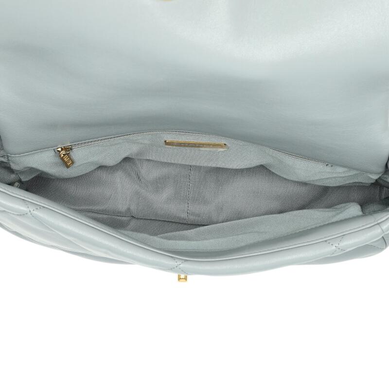 This is an authentic CHANEL Lambskin Quilted Medium Chanel 19 Flap in Dark Grey. This pillowy soft shoulder bag is crafted of oversized quilted lambskin leather in grey. The refined bag features a chain detail CC turn-lock on the flap, a magnetic snap pocket at the rear, and a leather threaded aged gold, ruthenium, and dark silver chain-link shoulder strap with a leather shoulder pad. The front flap opens to a fabric interior with a zipper pocket.