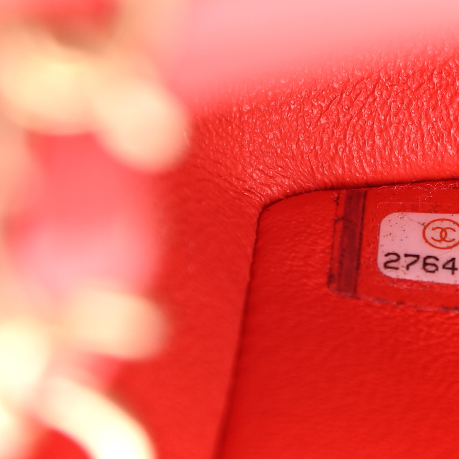 This is an authentic CHANEL Lambskin Quilted Mini Rectangular Flap in Red. This little cross body mini flap is featured in lambskin diamond quilted leather in red. The bag features an aged gold cross body leather threaded shoulder strap and a matching Chanel CC turn lock. This opens to a matching leather interior with zipper and patch pockets.