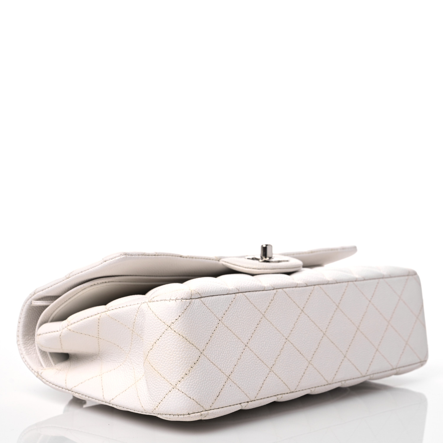 This is an authentic CHANEL Caviar Quilted Medium Double Flap in White. This stunning shoulder bag is crafted of diamond quilted luxurious caviar leather in white. The bag features a silver chain-link leather-threaded shoulder strap, a rear patch pocket, and a silver Chanel CC turn lock. This opens to reveal an inner flap and a matte white leather interior with patch pockets.