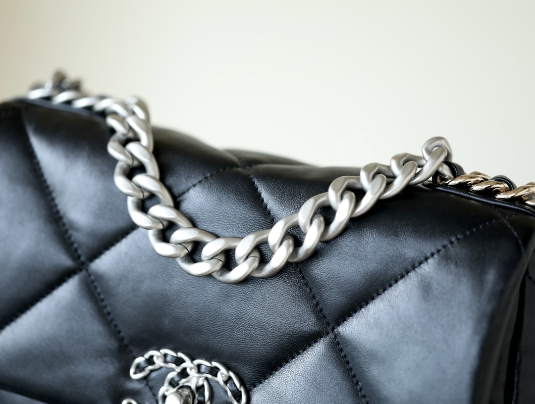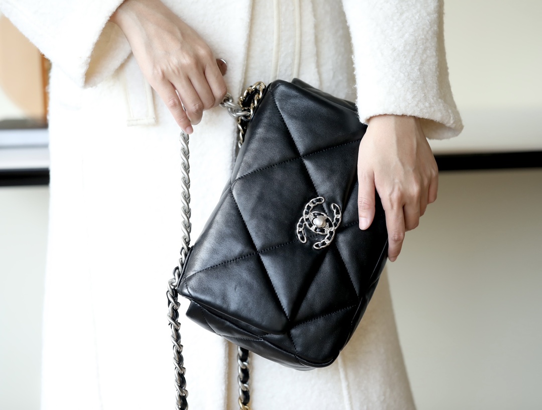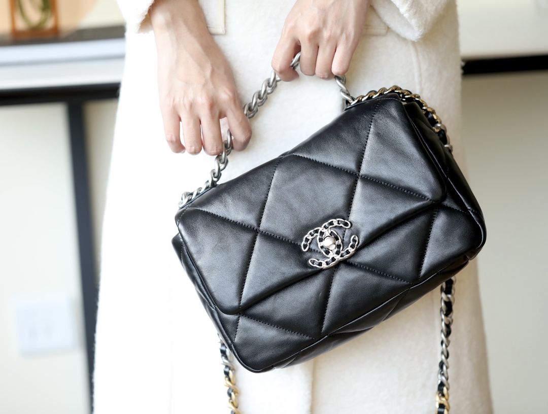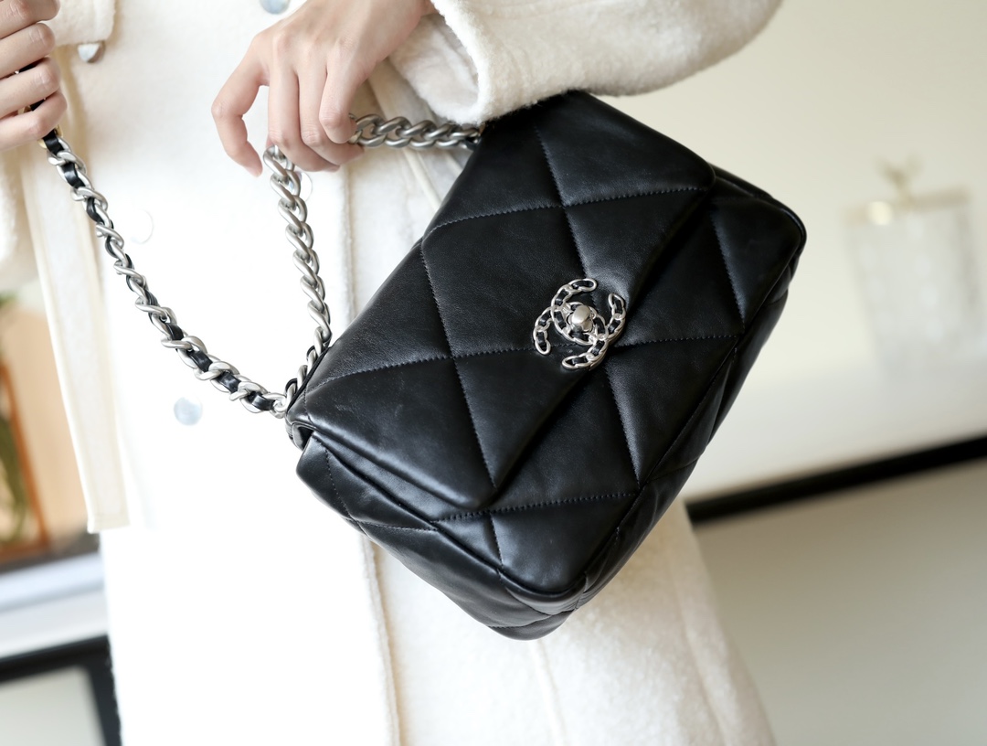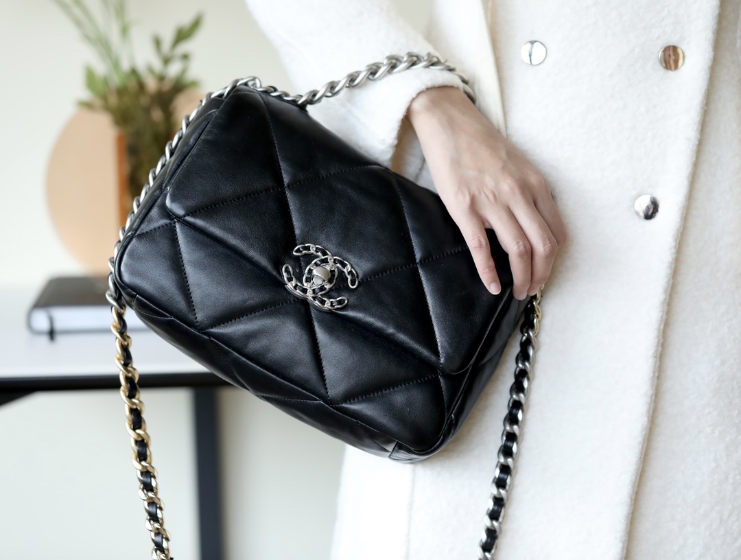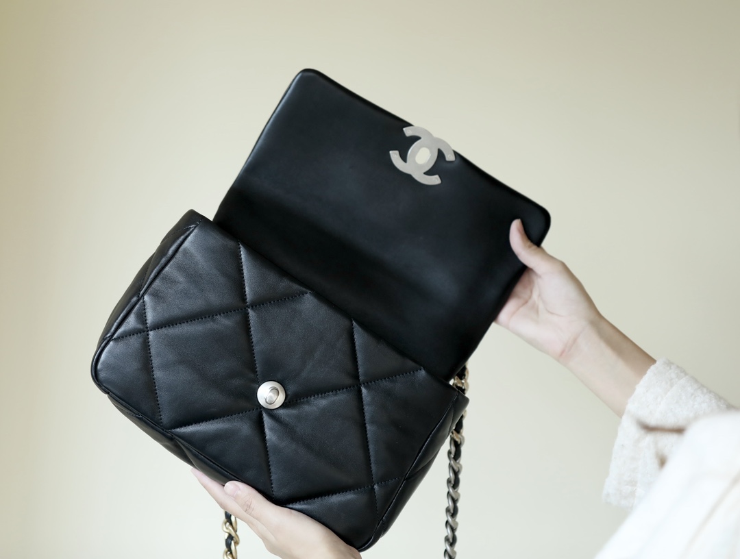• CHANEL 19 Handbag Lambskin, Gold-Tone, Silver-Tone & Ruthenium-Finish Metal black