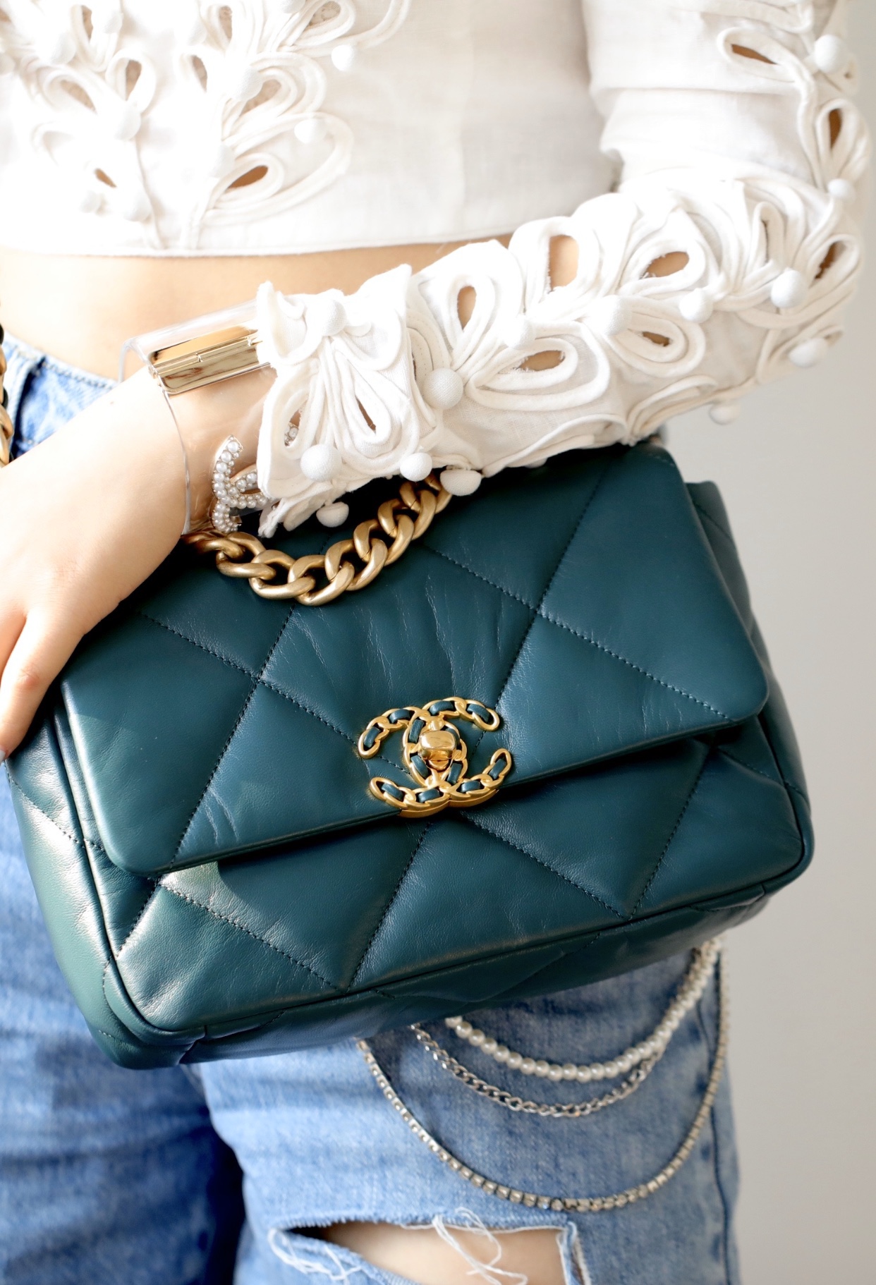 CHANEL 19 Lambskin Gold Hardware in dark green