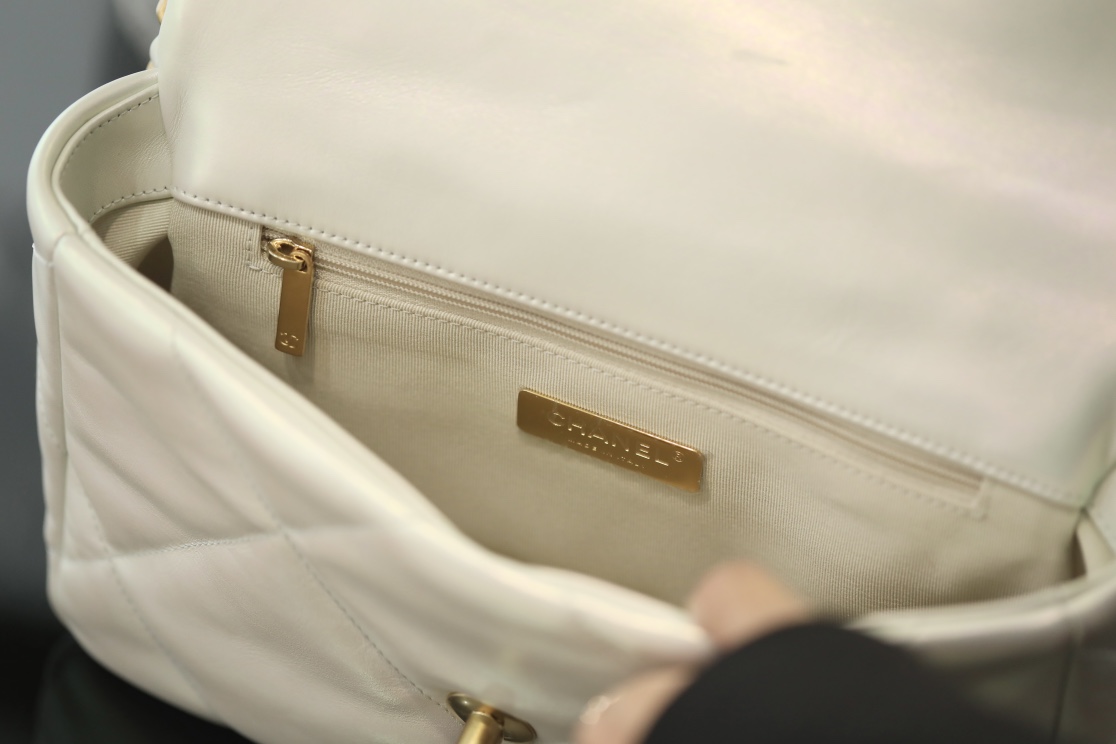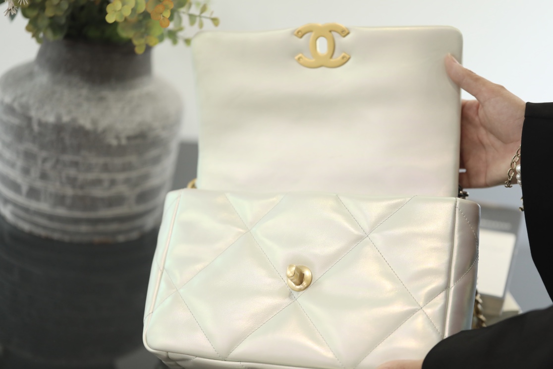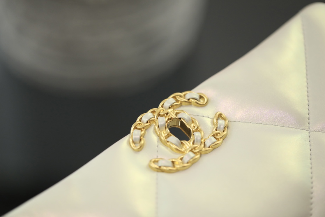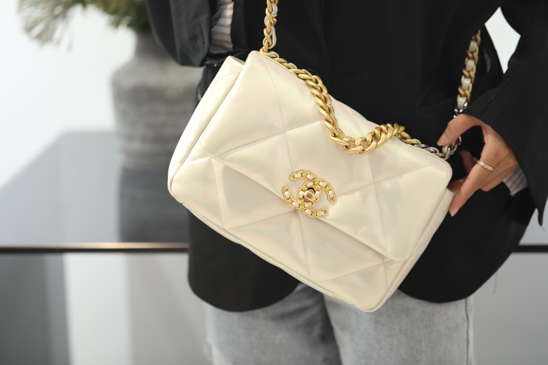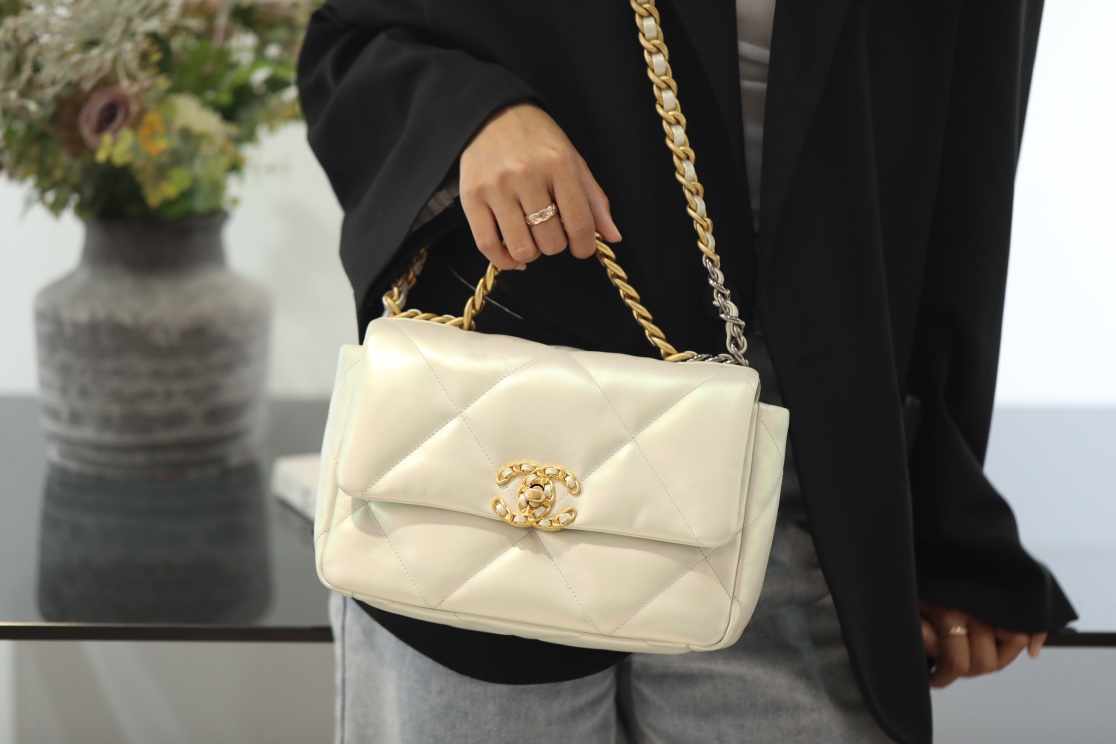 • CHANEL 19 Lambskin Gold Hardware in Pearl White