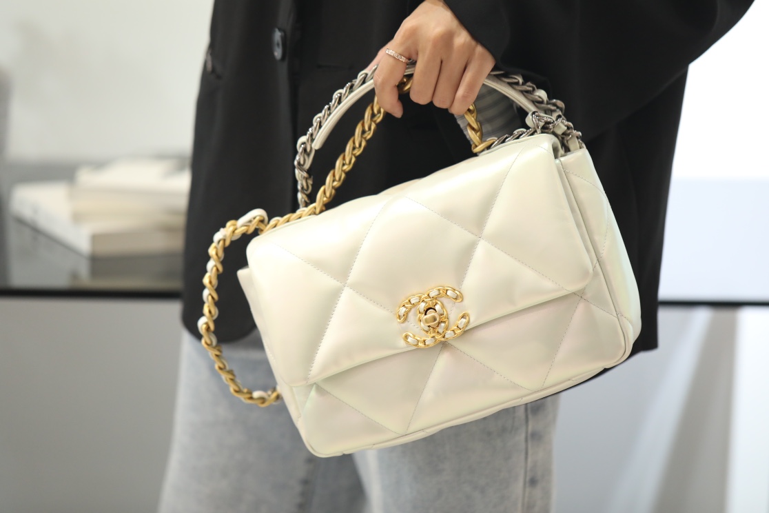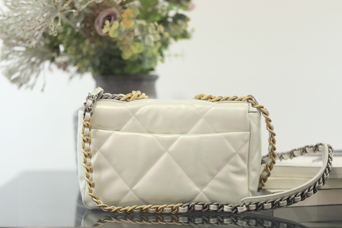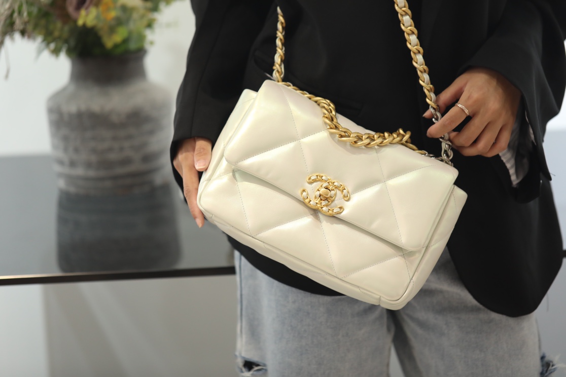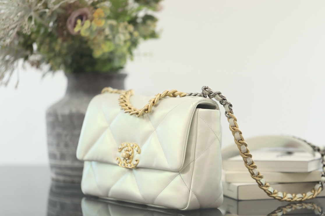 CHANEL 19 Lambskin Gold Hardware in Pearl White
