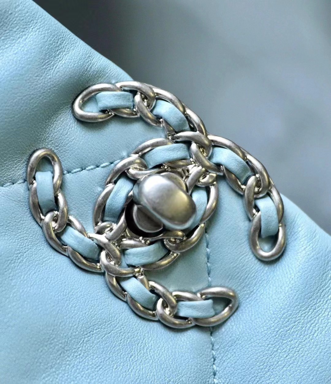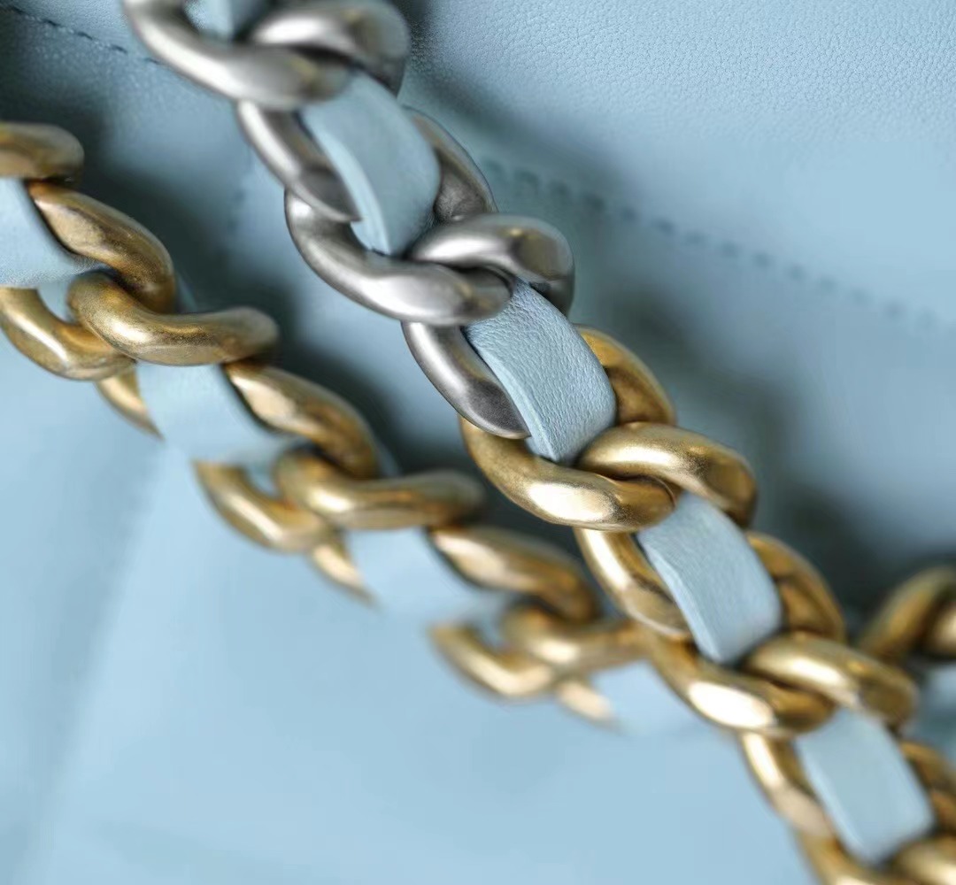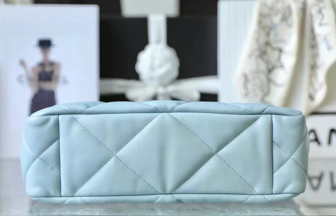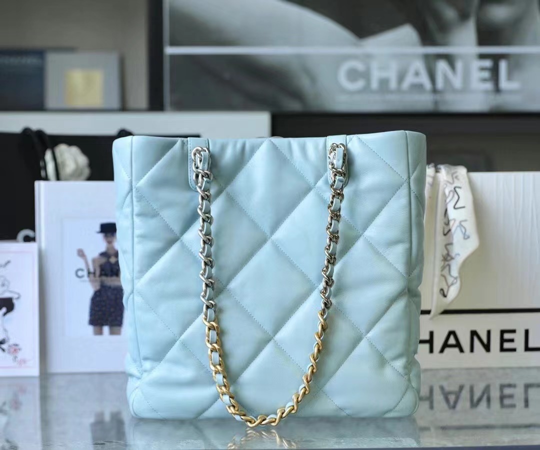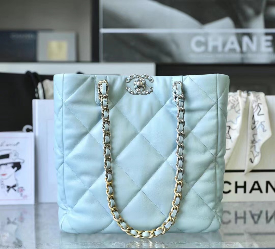 CHANEL 19 Shopping Bag Shiny Lambskin, Gold-Tone, Silver-Tone & Ruthenium-Finish Metal baby blue