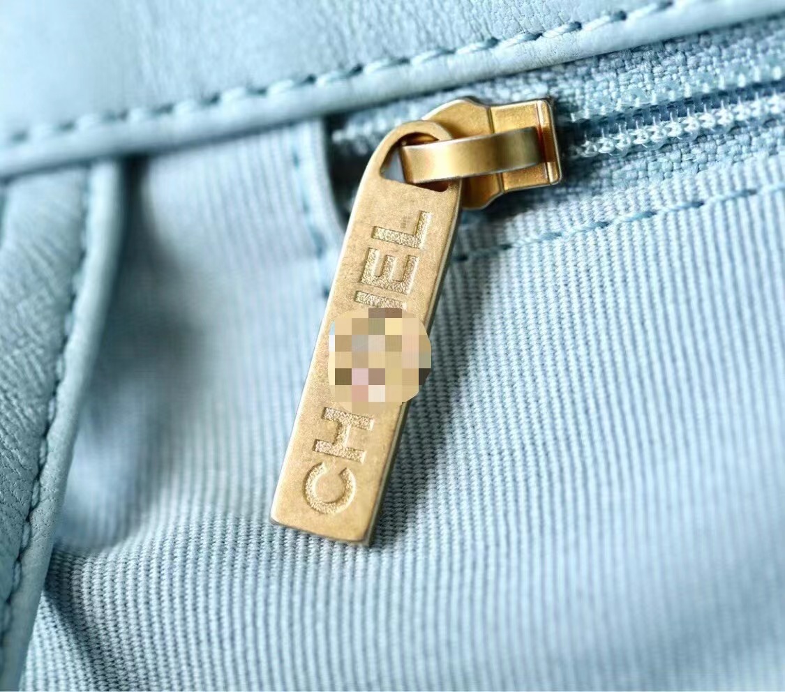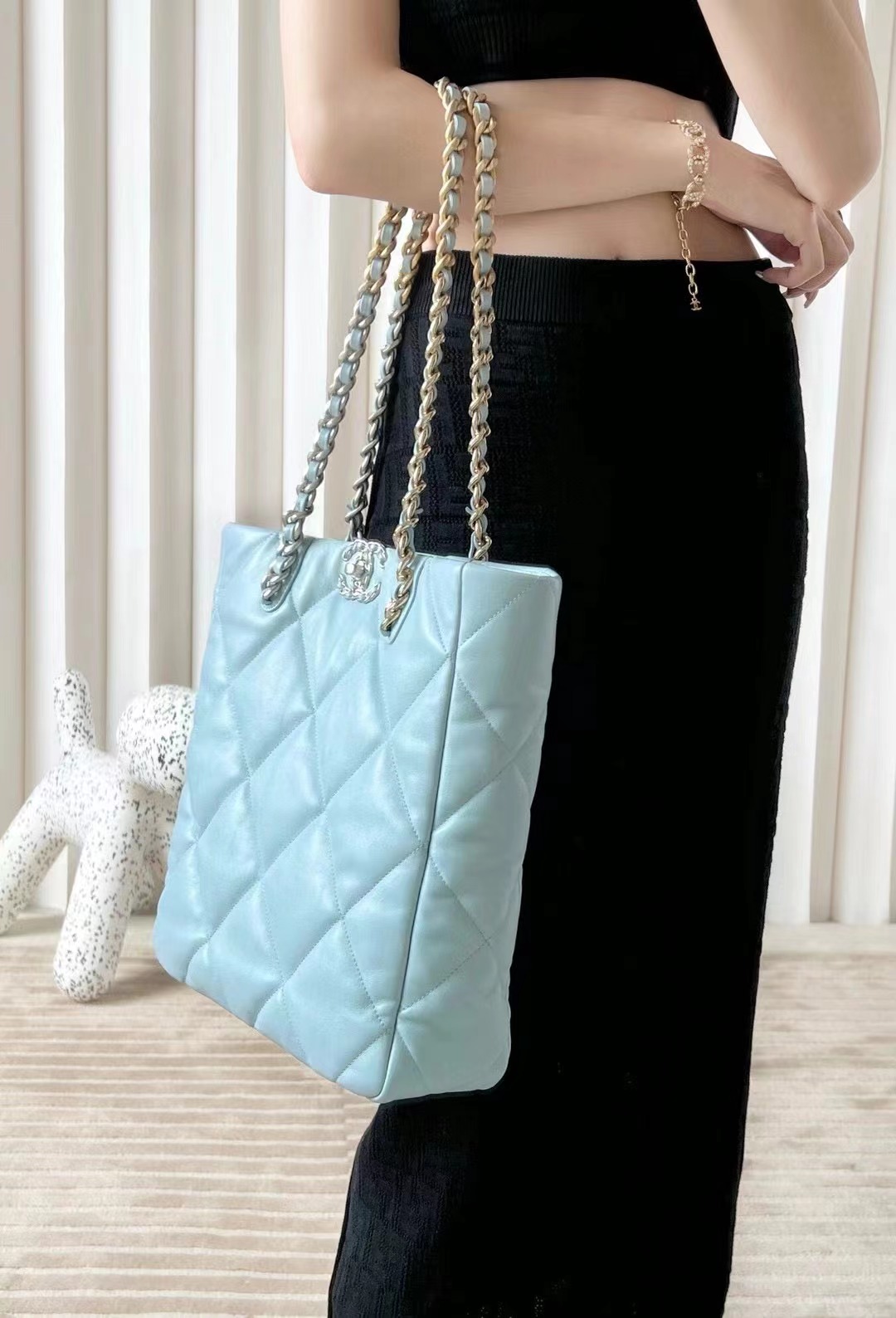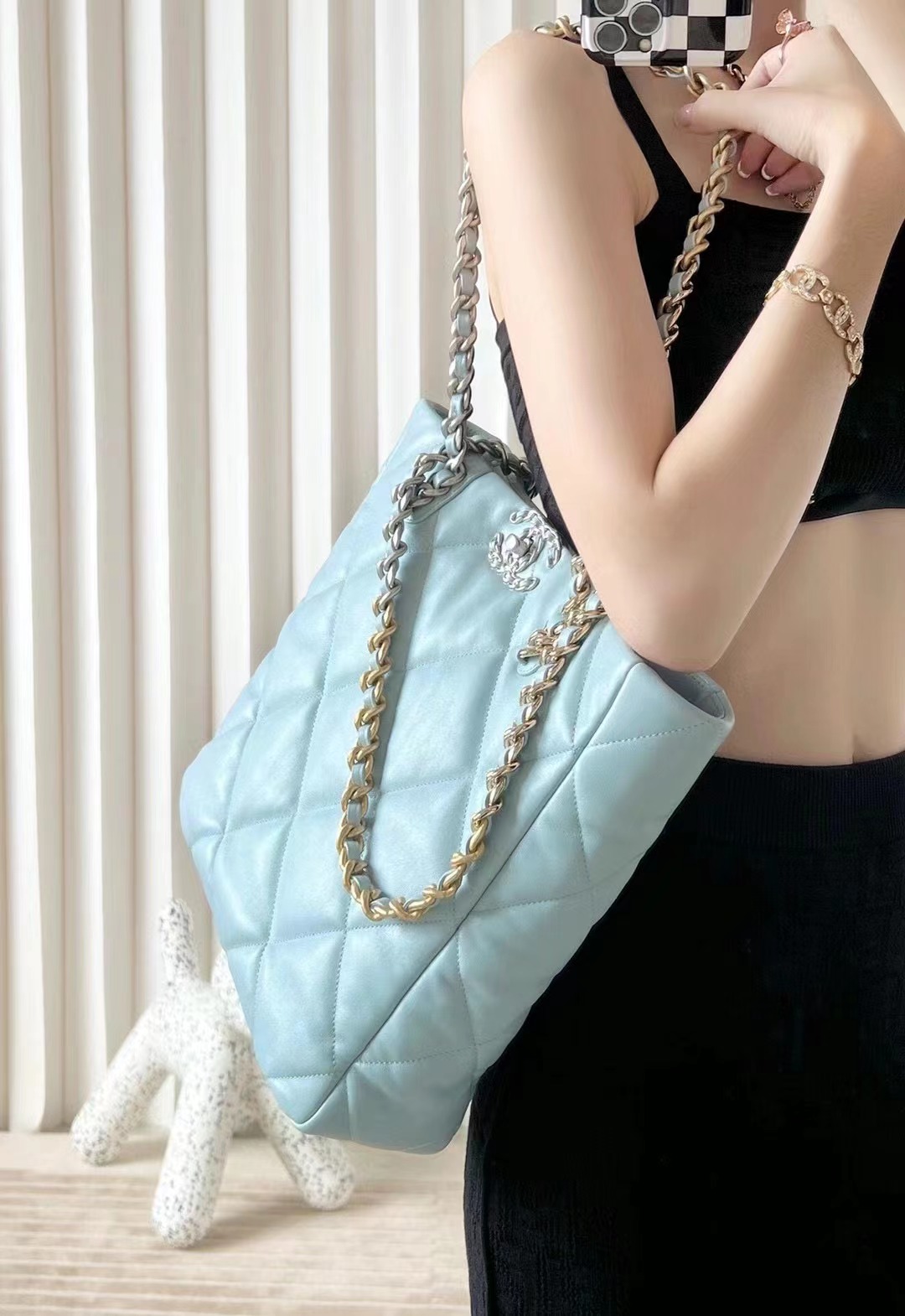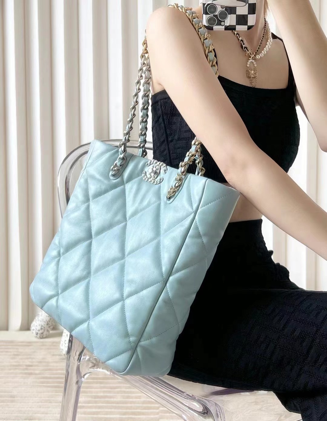 CHANEL 19 Shopping Bag Shiny Lambskin, Gold-Tone, Silver-Tone & Ruthenium-Finish Metal baby blue