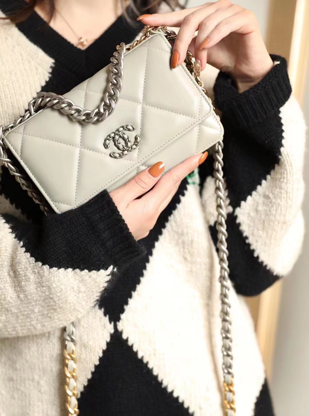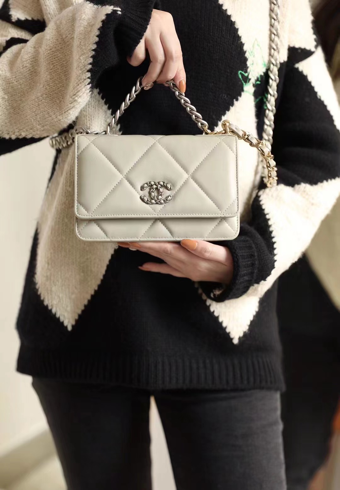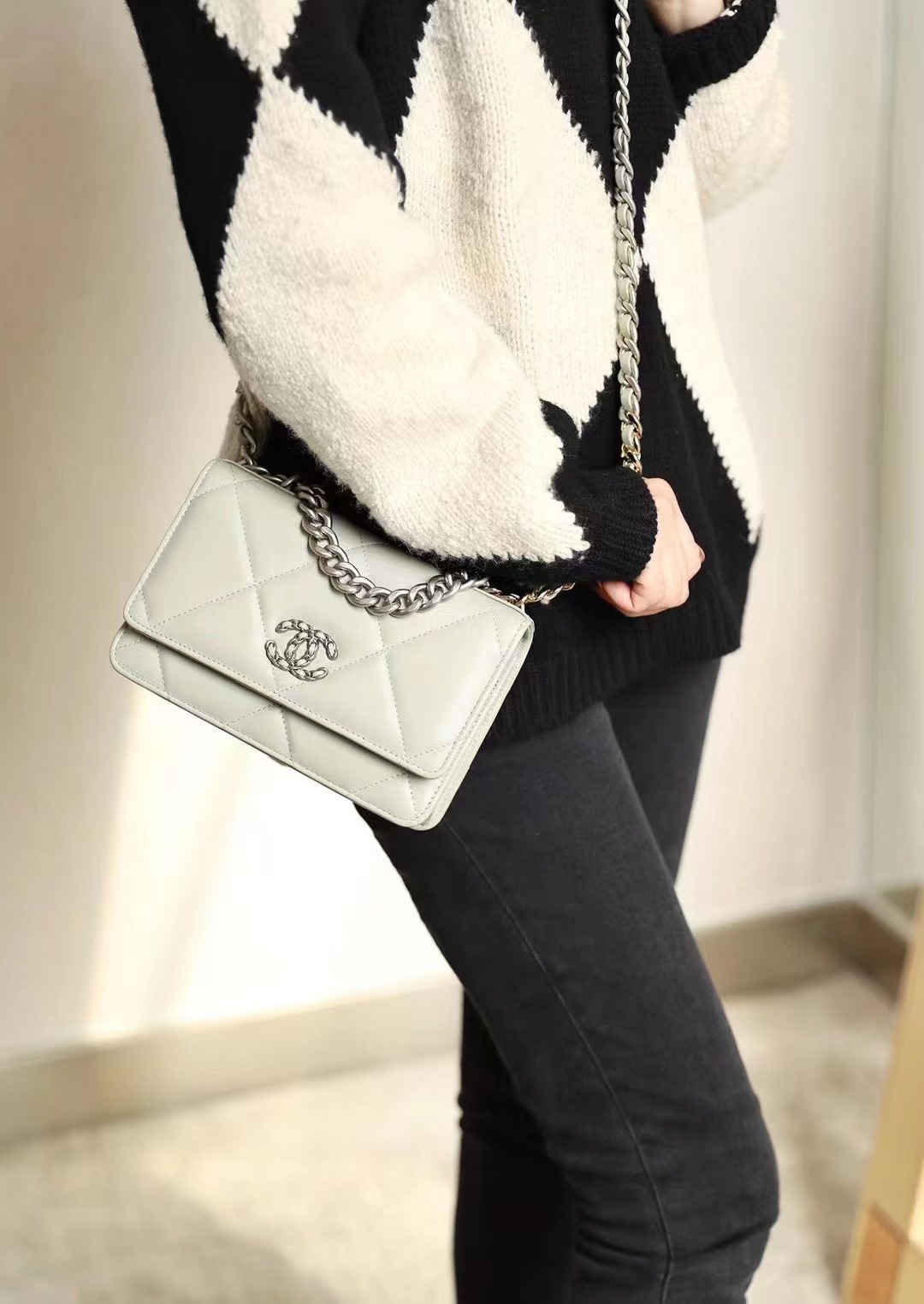 CHANEL 19 Wallet on Chain Lambskin & silver Metallic Pearl Gray