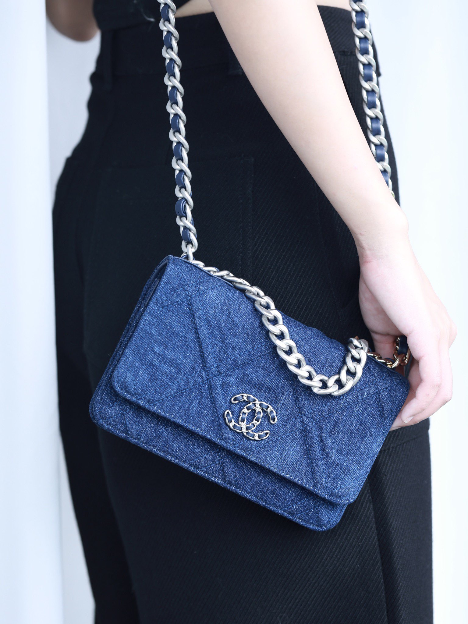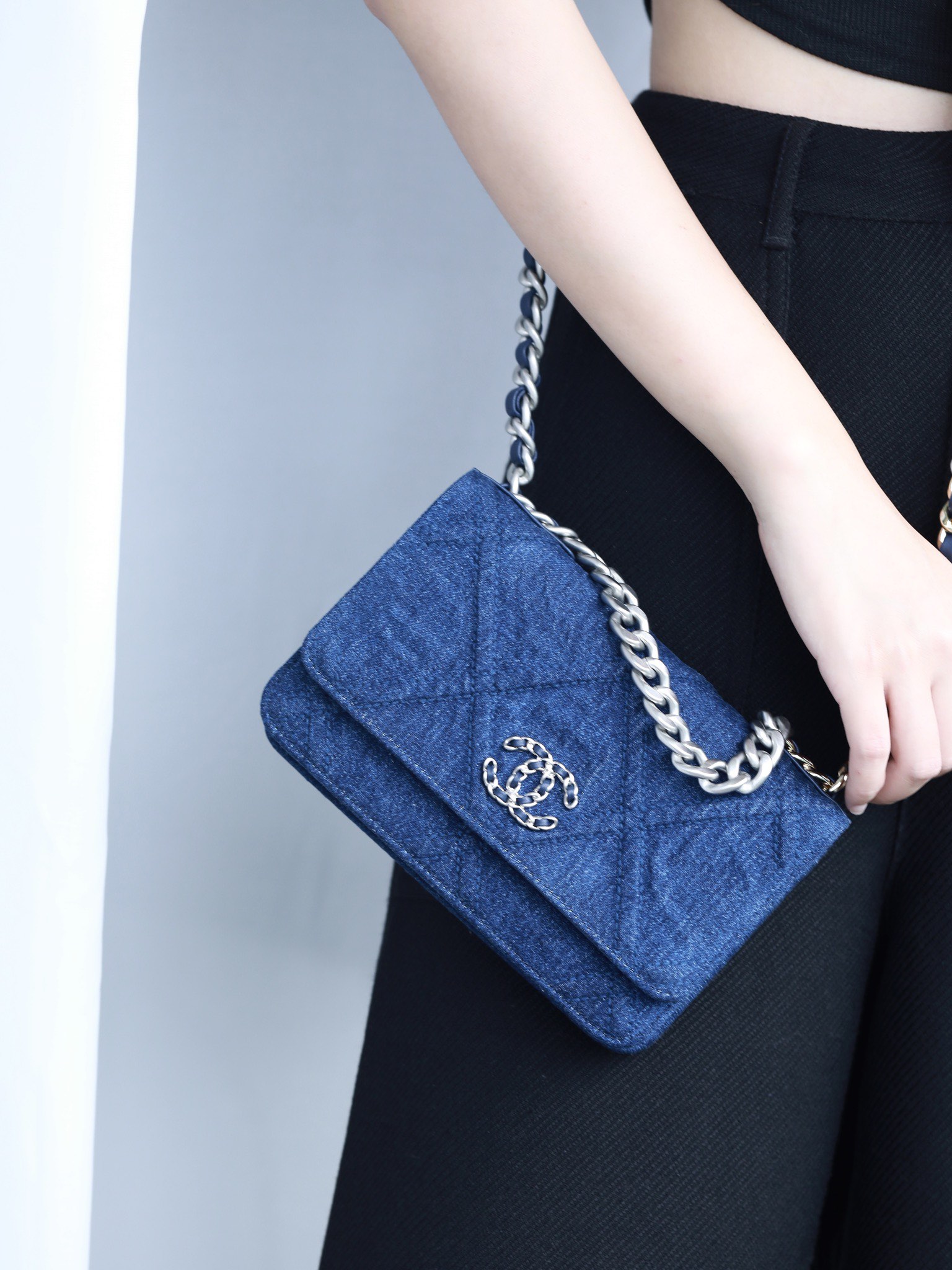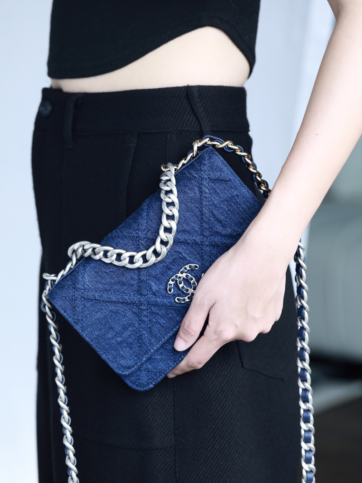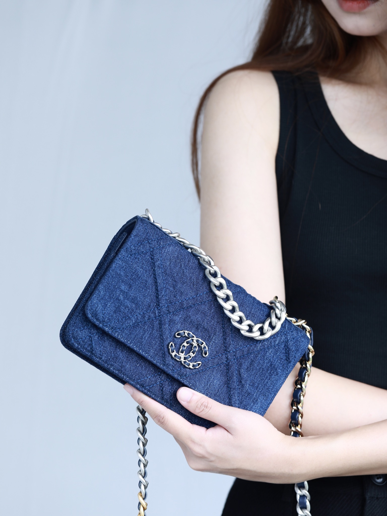 • CHANEL 22 Denim Quilted 19 Wallet On Chain WOC Crossbody Bag