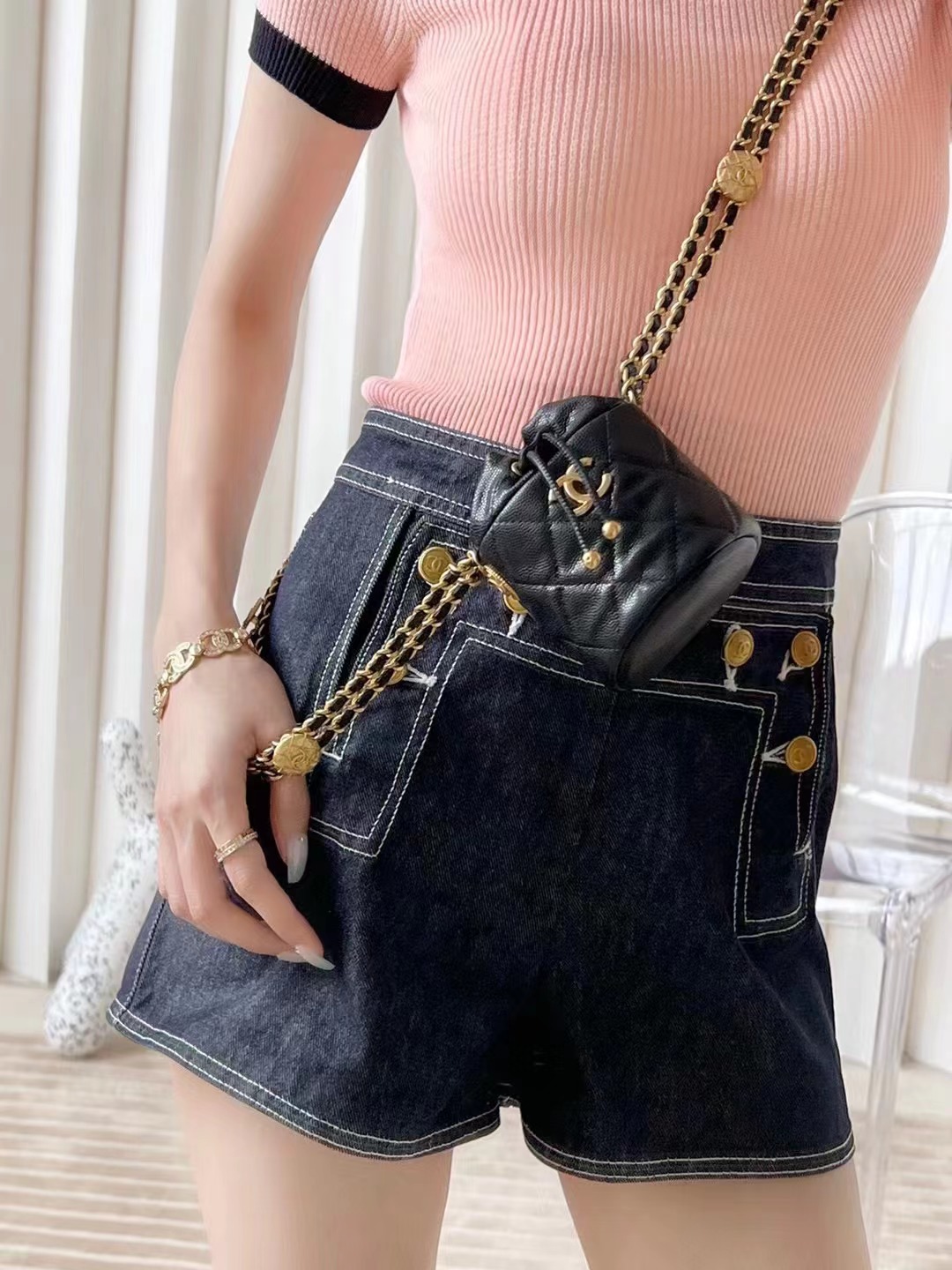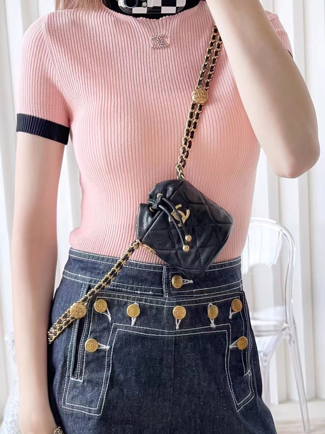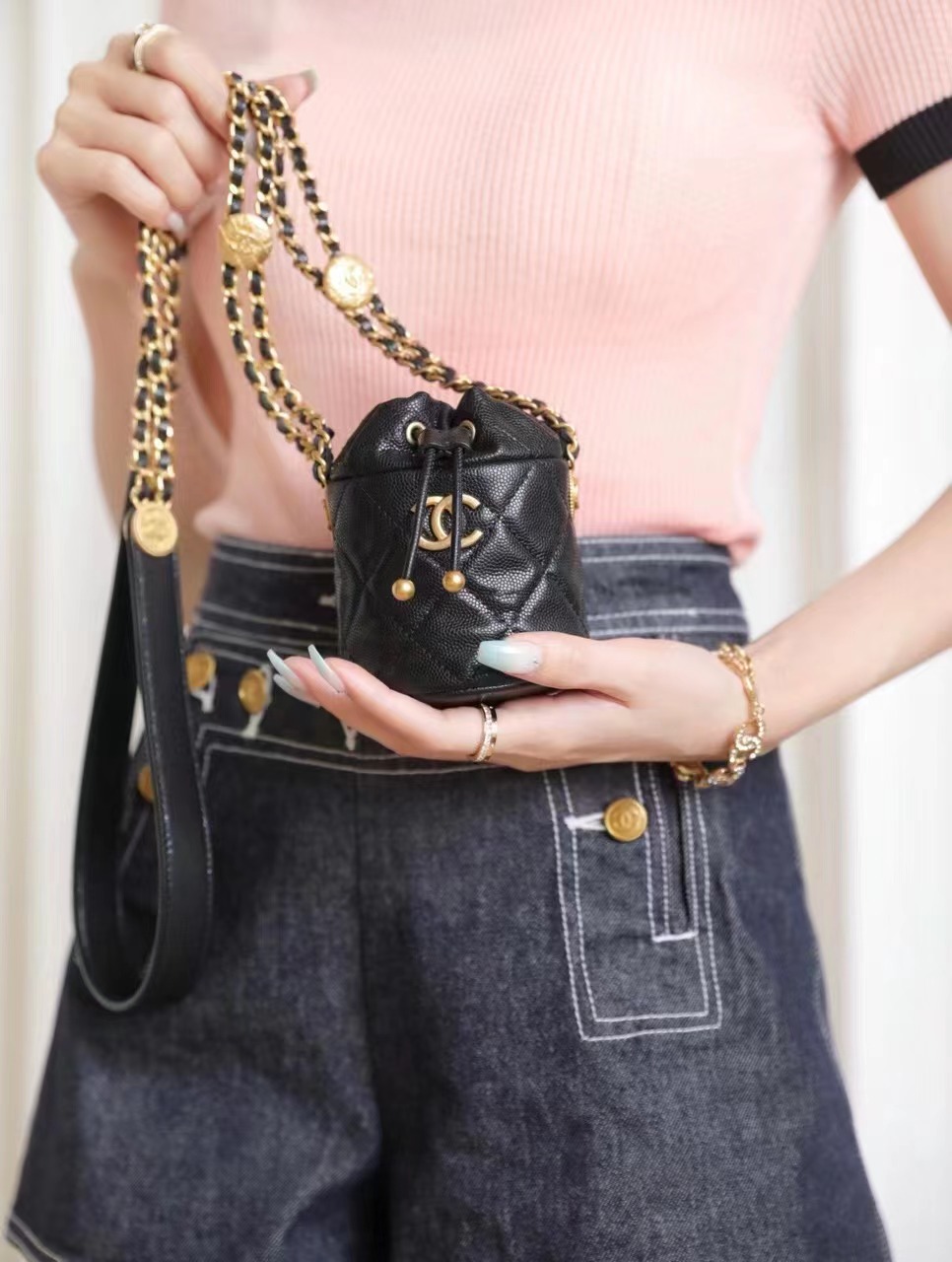CHANEL 22 gold coin chain mini bucket bag