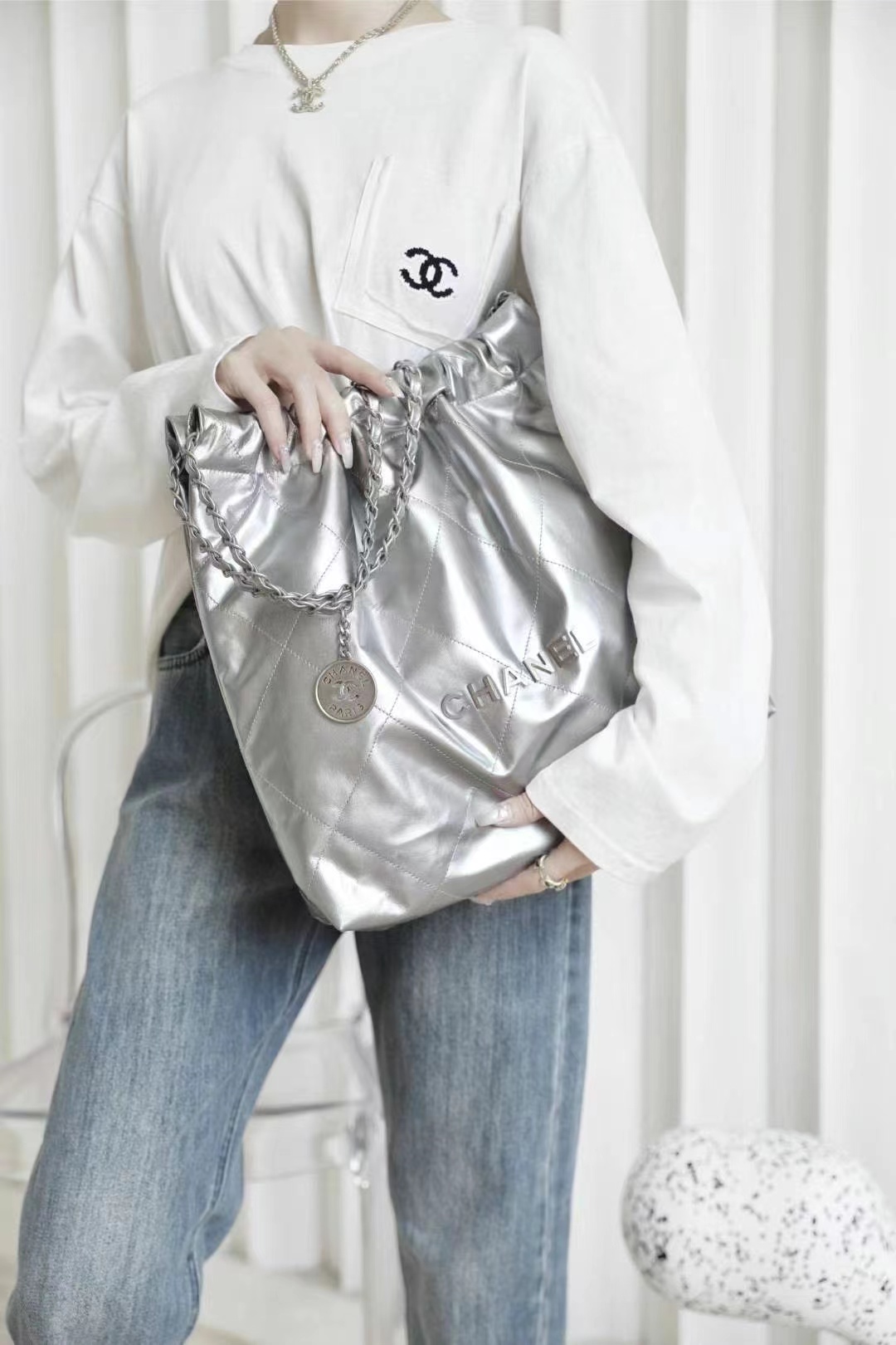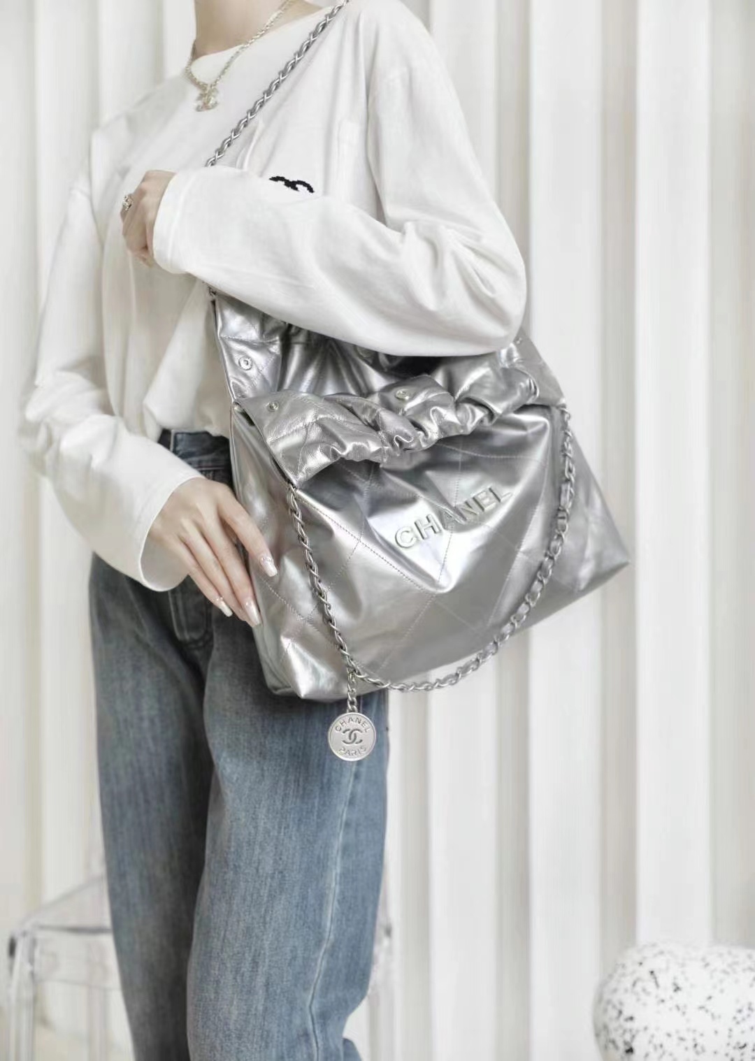 • CHANEL 22 Handbag Metallic Calfskin & Silver-Tone Metal Silver 42CM