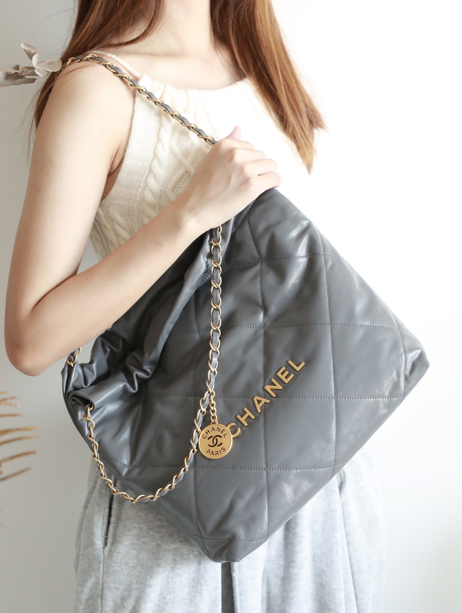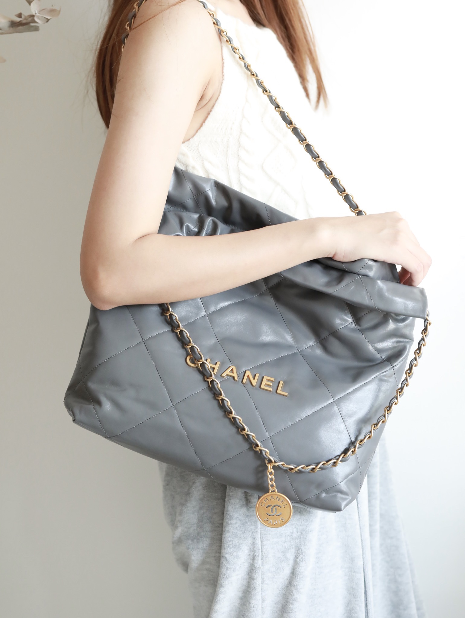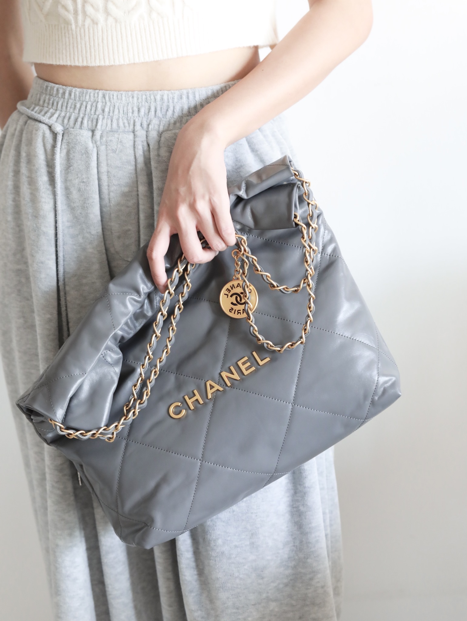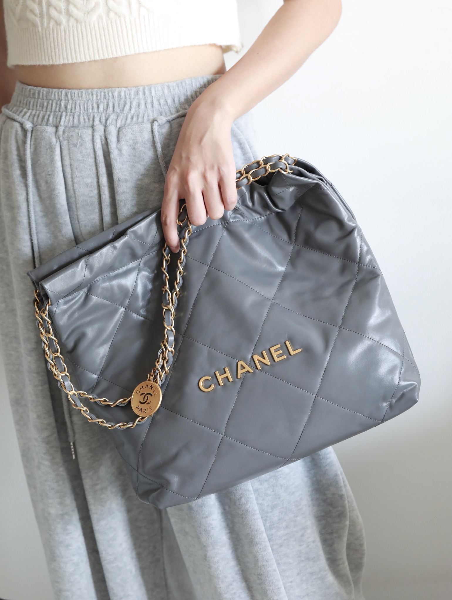 CHANEL 22 Handbag Shiny Calfskin & Gold-Tone Metal Advanced gray