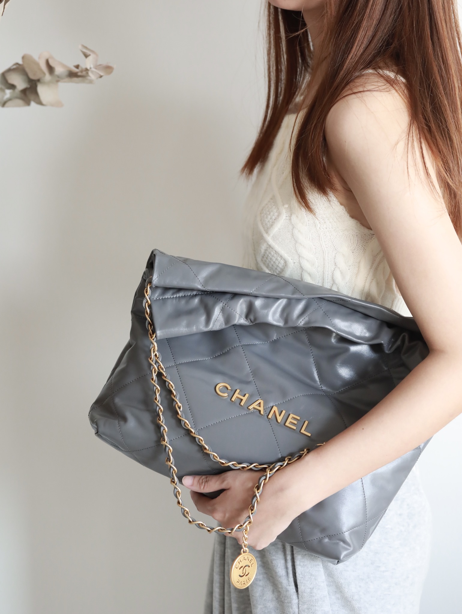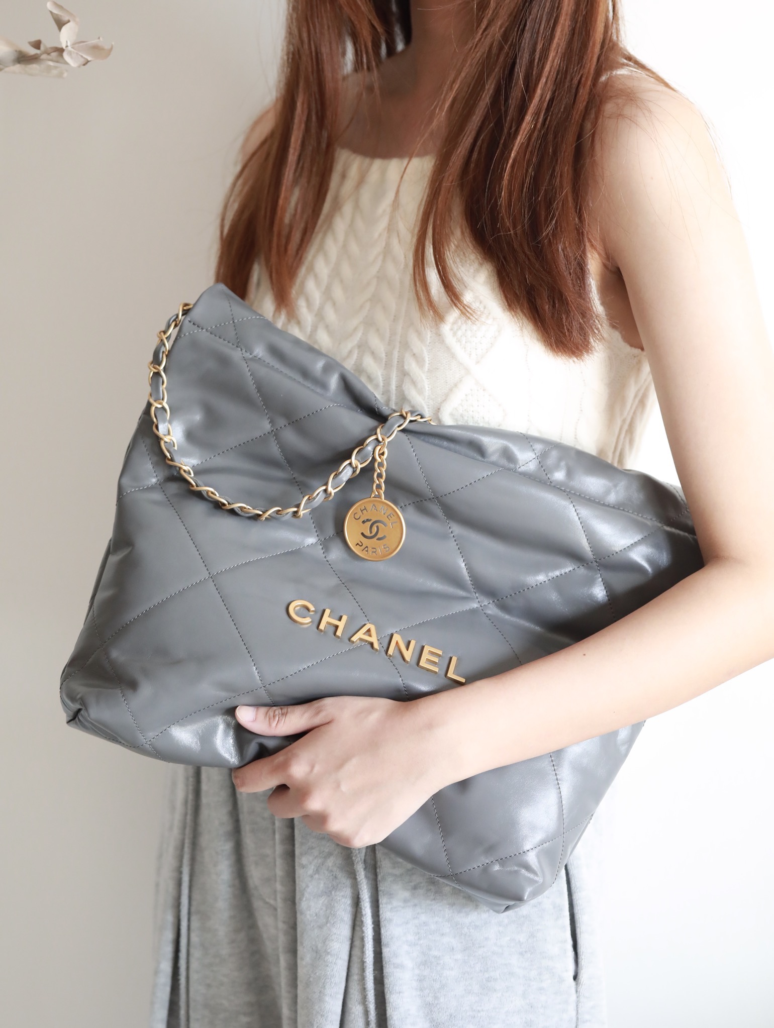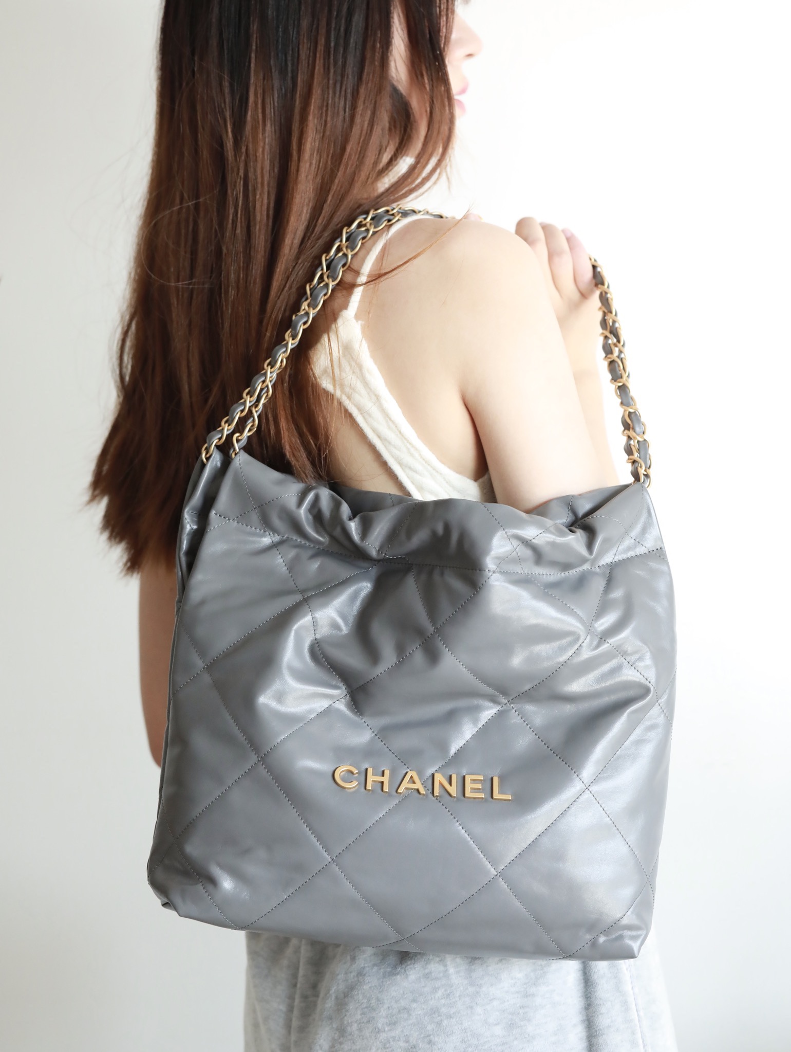 • CHANEL 22 Handbag Shiny Calfskin & Gold-Tone Metal Advanced gray