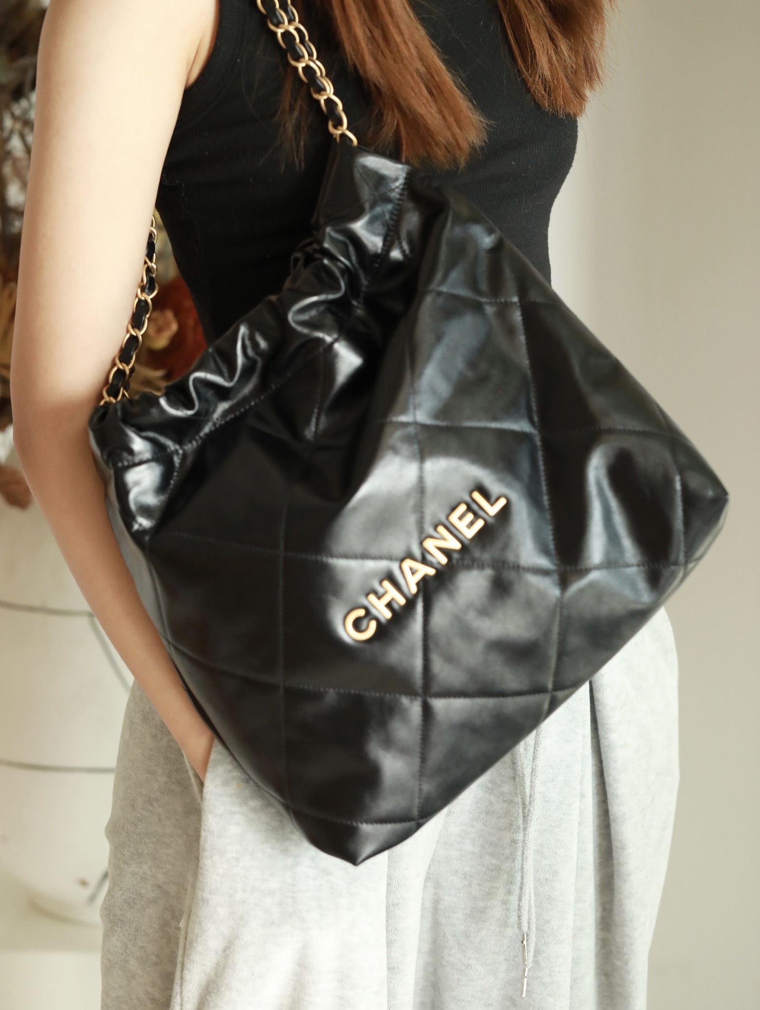 • CHANEL 22 Handbag Shiny Calfskin & Gold-Tone Metal Black & White
